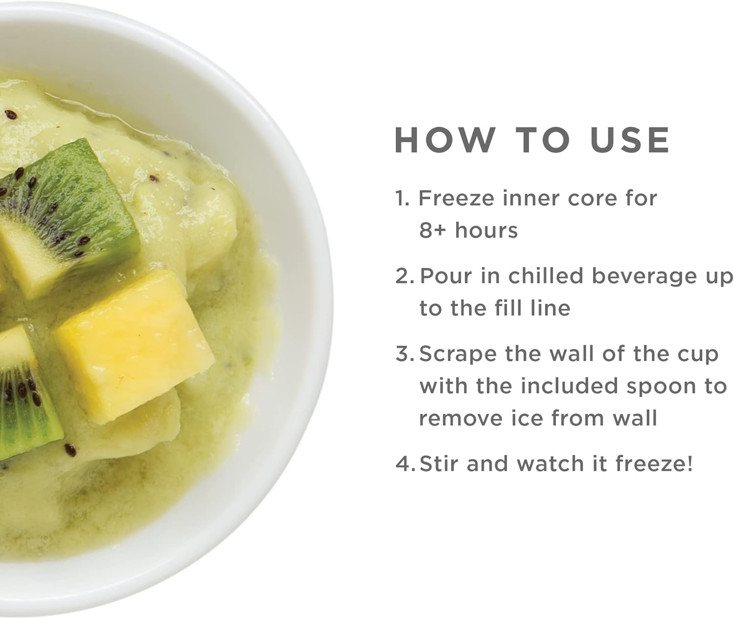 EASY TO USE: Freeze the inner core for 8+ hours, remove from freezer and place it in to the outer cup, pour in your ingredients, mix and scrape the cup with the included spoon, watch as the slush freezes before your eyes; hand wash with warm water
