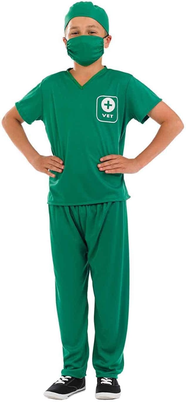 El conjunto de veterinario de alta calidad para niños incluye una parte superior con logo de veterinario verde, pantalones a juego, mascarilla verde y gorra a juego.