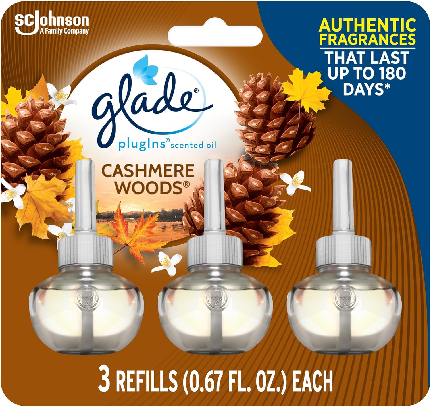 Glade PlugIns Refills Air Freshener, Scented and Essential Oils for Home and Bathroom, Cashmere Woods, 2.01 Fl Oz, 3 Count