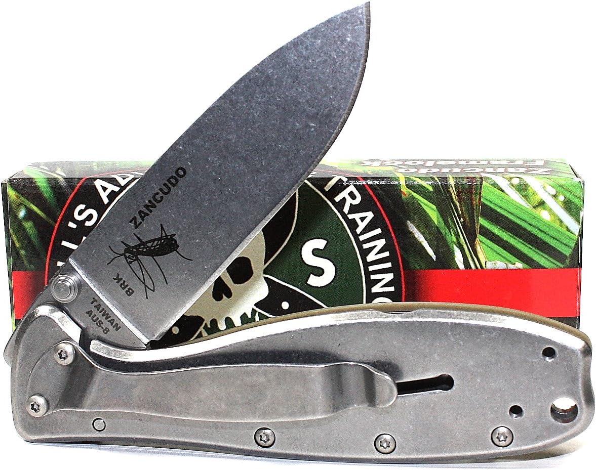 Designed by ESEE Knives Randall's Adventure and Training School of Survival. The word Zancudo is Spanish for Mosquito. The Zancudo is a 4" framelock tactical folder. Model R1DT features a 3" AUS-8A stainless blade with a Stonewash finish. Desert Tan G-10 front handle with a Stonewash stainless back. Includes a lanyard hole and Stonewash stainless pocket clip. These Zancudo folders are not manufactured by ESEE, nor do they carry the ESEE logo. The round Randall's Adventure & Training logo was licensed to Blue Ridge for use on these knives. This folder is designed and fully endorsed by Mike Perrin and Jeff Randall. ESEE does not warranty, market or sell these folders. For warranty information contact Blue Ridge Knives.