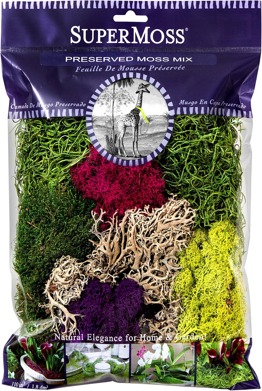 SuperMoss Moss Mix is a collection of our best-selling mosses so you can mix and match, experiment with new styles and get a feel for the different types of our mosses. Our Moss Mix is a variety of the following mosses and lichens: Spanish Moss in Grass Green, Reindeer Moss in Chartreuse, Sheet Moss and Lichen Parmelia with tufts of Fuchsia Reindeer Moss in the center! SuperMoss Moss Mix is a great product for decorative purposes and for terrariums or crafts.