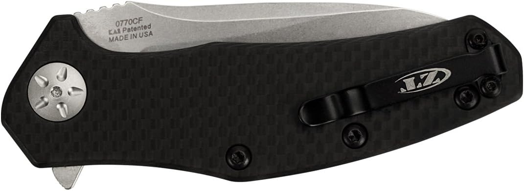 Zero Tolerance’s 0770CF is an inspired design from the award winning ZT 0777. The 0770CF offers the style and performance of the 0777, in a slightly smaller, more streamlined frame. The 0770CF’s blade is made of high-performance Crucible S35VN powdered steel, known for its excellent edge retention, toughness and wear and chip resistance. A stonewash finish is easy to maintain and helps hide hard-use scratches for a rugged non-reflective appearance. The sweeping lines of the original 0777 are preserved in an extremely lightweight carbon fiber handle, with a secure and comfortable in-hand feel. Kershaw’s award winning SpeedSafe assisted opening system uses a torsion bar to move the blade out of the handle quickly and easily for smooth, one-handed operation. For the final touches, Zero Tolerance added an inset liner lock to secure the blade safely open during use, a user-adjustable, reversible, deep-carry pocketclip and a handsome oversized pivot to best the 0770CF’s distinct build.