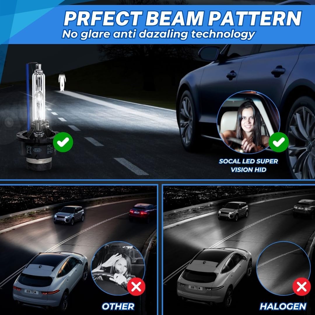 Super Bright Illumination: Experience unparalleled visibility on the road with SOCAL-LED LIGHTING D2S Xenon HID Headlight bulbs. Their brilliant 6000K cool white lighting enhances night driving safety, making it a must-have upgrade.