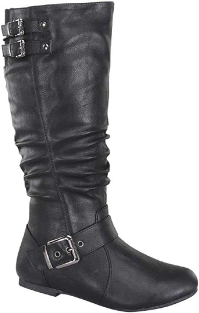 TOP Moda Night-76 Women's Mid Calf Round Toe Buckle Slouched Flat Boots