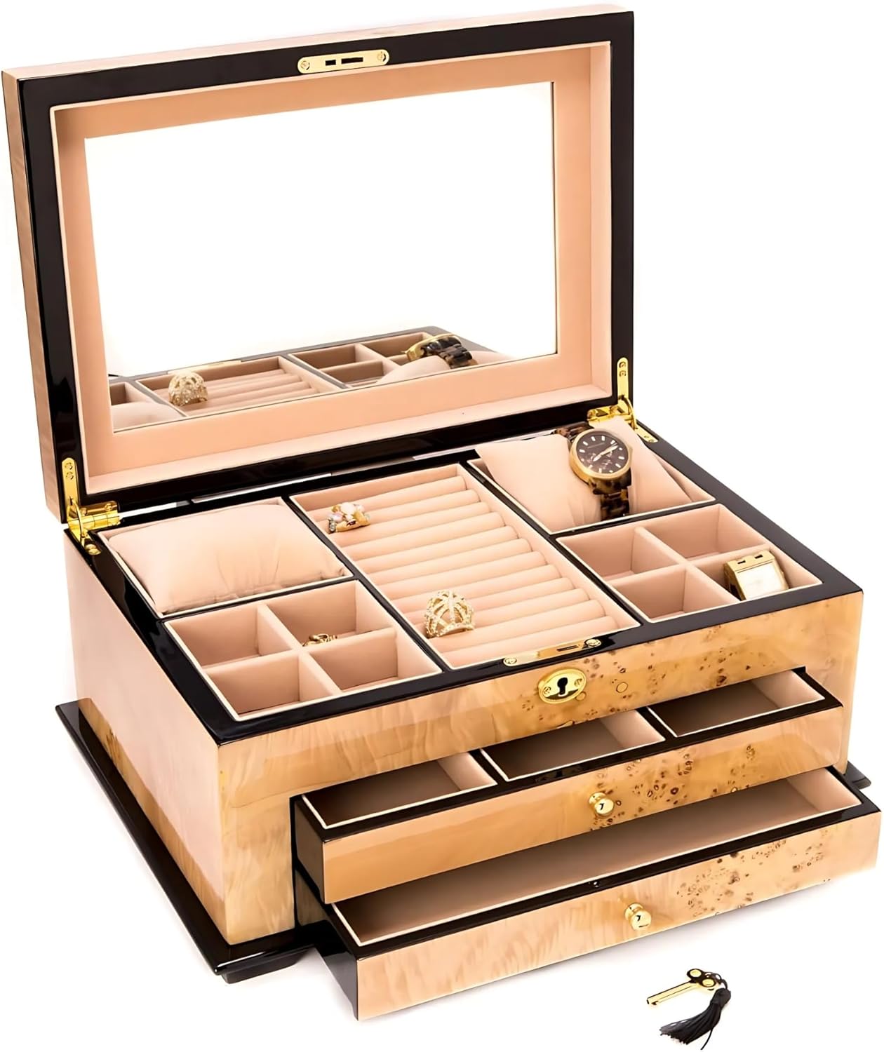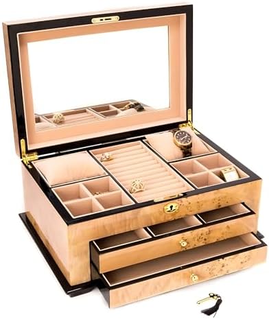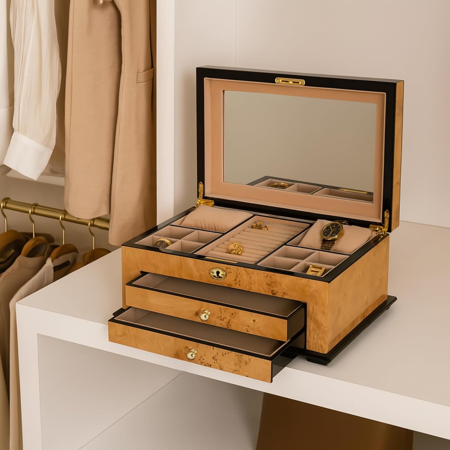 This elegant lacquered "Birdseye Maple" wood jewelry chest offers a stylish solution for organizing your jewelry accessories collection. Featuring three levels including a top tray and two spacious storage drawers, it provides dedicated spaces for rings, bracelets, watches, and more. The soft velour lining cushions delicate pieces, while the mirror under the lid adds convenience. A gold latch closure adds a sophisticated touch, making it perfect for bedroom decor or as a thoughtful gift for jewelry lovers. Functional yet decorative, this jewelry organizer blends beauty with practicality.
