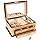 Bey-Berk Birdseye Maple Lacquered Wood Jewelry Chest with Gold Accents, 3-Level Drawers, Mirror & Soft Velour Lining