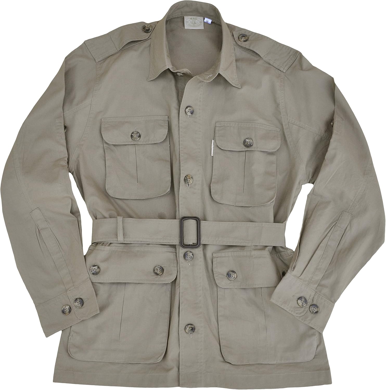 Safari Jacket for Men is constructed from light-weight 5 1/2 ounce cotton fabric. Layer over a T-shirt or hunting shirt for cool comfort. Two buttoned flaps covered chest pockets and two cargo pockets at the waist provide ample storage for essential outdoor gear. Cross-stitched epaulettes keep a pair of binoculars or a canteen from sliding off your shoulder. Functional Swiss tabs keep sleeves neatly rolled up. Full buttoned front and belted waist for a classic safari look. Not your grandfather's heavy jacket. Made in Africa from garment washed and pigment-dyed cotton. Generously sized for comfort. Worn alone or over other clothing, this men’s safari jacket is an authentic original and the choice of explorers, trackers, guides, and big game hunters the world over.
