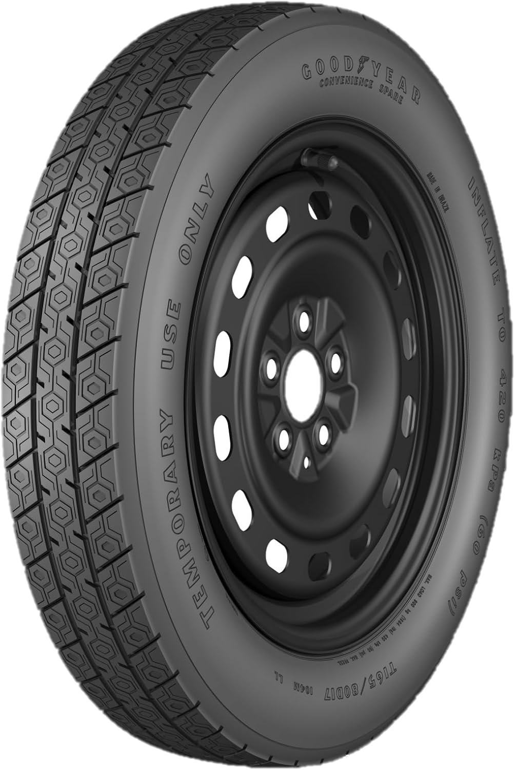 The Goodyear Convenience Spare Nylon is a compact, all-season temporary spare tire for passenger vehicles and SUVs. Designed for limited use, it offers all-weather traction and enhanced controllability, improving steering response and stability. With a lightweight construction and space-saving design, it's easy to store and transport, though it should not be used in harsh weather conditions. Limited to 50 mph and 60 psi, it's perfect for temporary replacements until a full-size tire can be installed.