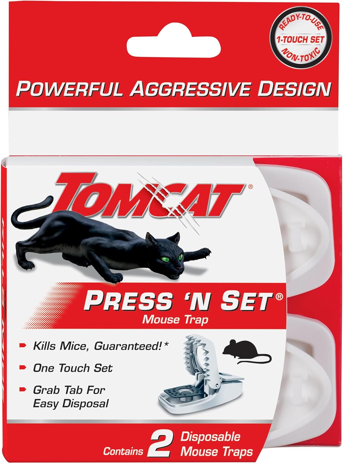 All it takes is one simple set. Tomcat® Press 'N Set® Mouse Trap is guaranteed* to kill mice and allows for easy, no-touch disposal. These plastic, spring-loaded snap traps are easy to set and reduce the risk of pinched fingers. To use, place a pencil eraser-sized dollop of food such as peanut butter into the bait well. After baiting, pull the set bar back the entire way until you hear a ""click"" to tell you it is locked. Mice have a natural tendency to run along walls as they move from hiding to feeding, so we recommend placing traps facing the walls of rooms or cupboards where activity is suspected, such as kitchens, basements, or garages (droppings and oily marks along baseboards are a telltale sign of activity). Once the mouse has been caught, pick up the trap using the grab-tab and dispose of the trap and the rodent in the trash. If you would prefer to reuse the trap, pinch it open and drop the dead rodent in the trash. Your fingers will never touch the dead mouse! This package of Tomcat® Press 'N Set® Mouse Trap contains 2 disposable mouse traps. *satisfaction guaranteed or your money back