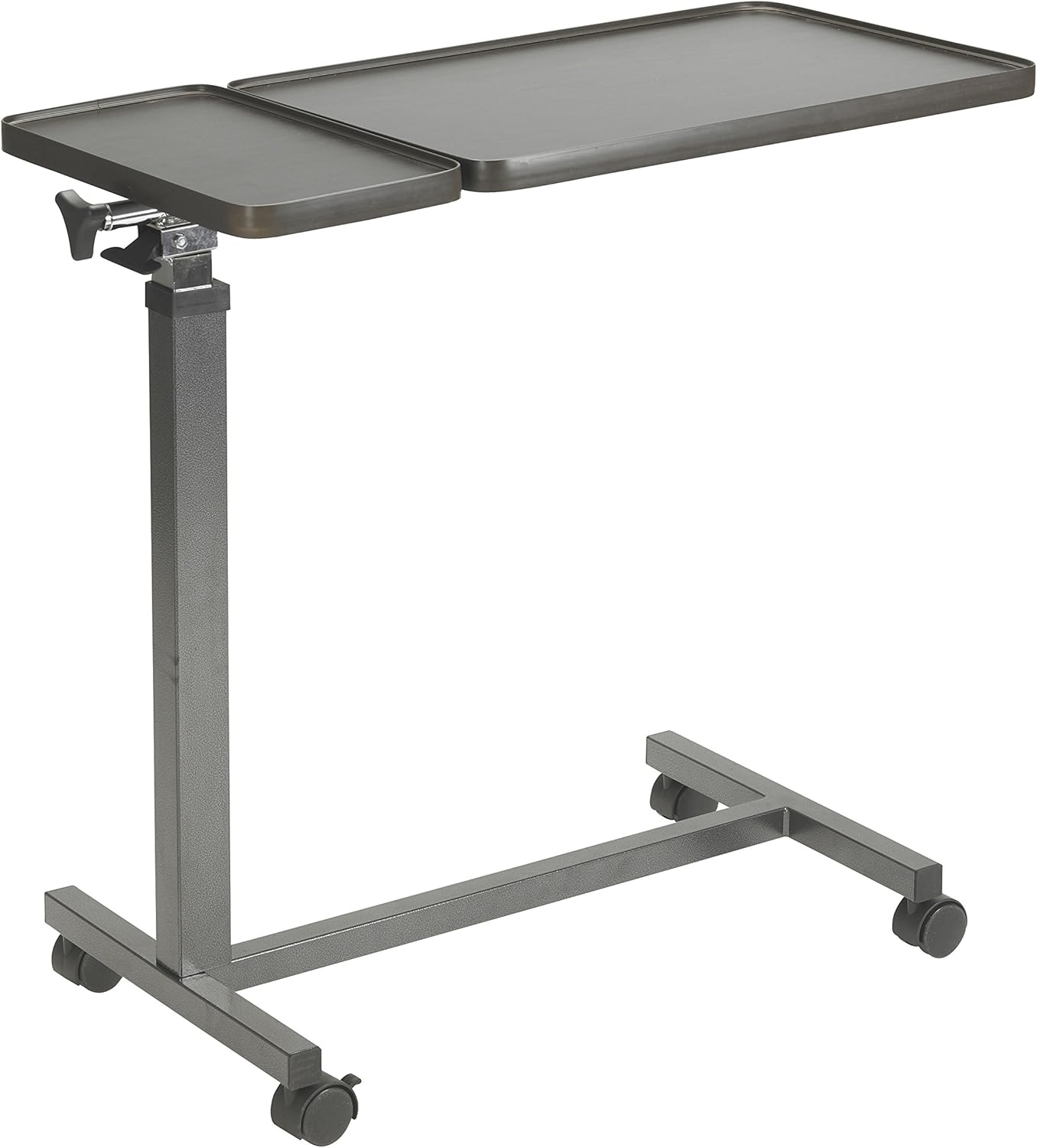 La mesa sobrecama multiusos con la parte superior inclinable de Drive Medical te ofrece dos superficies estables e independientes para comer, trabajar o entretenerte. La altura de los atractivos tableros de madera veteada se puede ajustar de forma infinita y la superficie más grande se puede inclinar para colocarla en la posición ideal para usted. La superficie más pequeña siempre permanece plana, por lo que es perfecta para guardar alimentos, bebidas, vasos, mandos a distancia u otros artículos de forma segura. Esta mesa sobre cama plegable y multiusos con la parte superior inclinable también se puede utilizar como estación de trabajo móvil, mesa de dibujo, escritorio para ordenador portátil, mesa de artista o bandeja de entretenimiento. Con una capacidad de peso de 55 libras, puedes estar seguro de que tus artículos estarán seguros y protegidos en esta mesa. El tablero de la mesa se puede levantar hasta 46 pulgadas, lo que permite que también se use como escritorio de pie. Además, las ruedas giratorias de la mesa Overbed facilitan las maniobras y permiten colocar la mesa donde sea más conveniente.