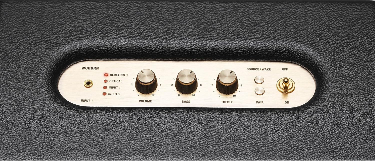 When it comes to sound quality, the Woburn spares no expense. It's designed with loud in mind. and you'll quickly hear by its performance that it holds true to the Marshall name. This loudspeaker hits high trebles cleanly, handles low bass with ease and has a clear, lifelike mid range. The analog treble, bass and volume knobs give you custom control of your sound. With unique sound design and quality components, it's made to deliver accurate response throughout the frequency range. The Woburn is literally built to thrill. The Woburn features a classic Marshall design, with a vintage-looking front fret, gold-colored metal details, and that iconic script logo. With its script logo, black vinyl casing and vintage-inspired fret grille cloth, the Woburn is an instant rock 'n' roll classic. The Woburn is larger than life with loud in mind! The Woburn is all about modern listening capability. That's why we added the option of connecting digitally via an optical cable. Hook your Woburn up to your TV, Apple TV, Airport express, hard disk player, streaming play, and satellite or cable receiver. Optical works with PCM stereo only. Some of your music knew a time before Bluetooth. That's why the Woburn enables you to go analog and connect to those devices that may be collecting dust in your basement. So come on! Dust off your CD player or turntable (with RIAA) and connect via the RCA input. This input can also be used with your Sonos unit. Inspired by the golden days of rock 'n' roll, this coiled double-ended stereo cable with two 3.5mm plugs is a modern take on the classic telephone guitar cord guitar cable. Kink-free and extendable, it's your music device's connection to a world of great sound. Frequency Required 50/60 Hz