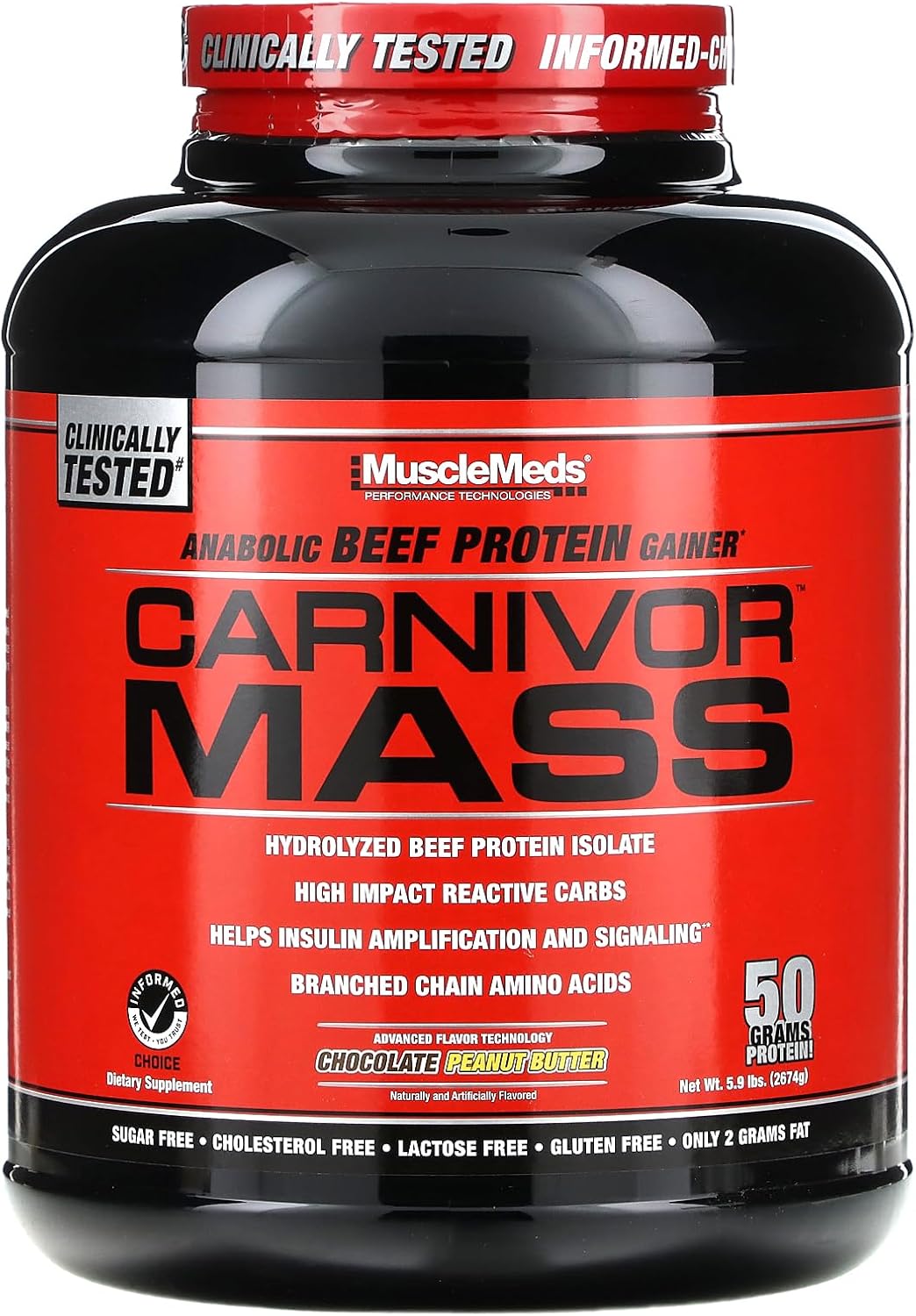 MuscleMeds CARNIVOR Mass Gainer Beef Protein Isolate Shake, 50 Grams Protein, 125 Grams Carbs, 0 Fat, 0 Sugar, Lactose Free, Halal Certified, Chocolate Peanut Butter, 6 Pound