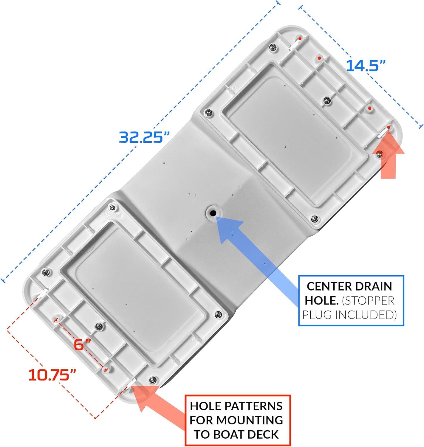 Cooler seat frame constructed of rotational molded high impact plastic, with anodized aluminum swing arms; Molded-in hold down can be mounted directly to the boat deck for stability