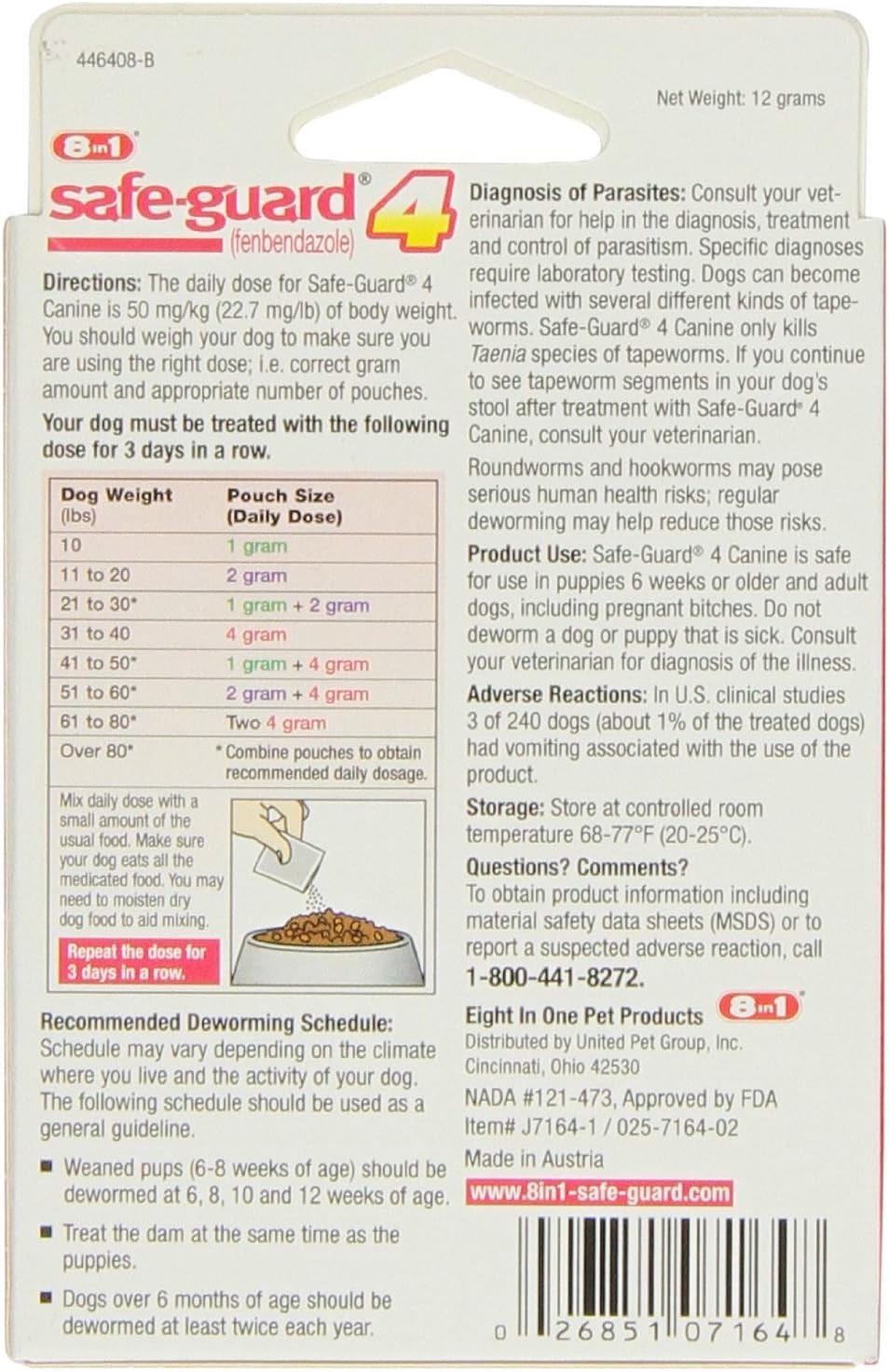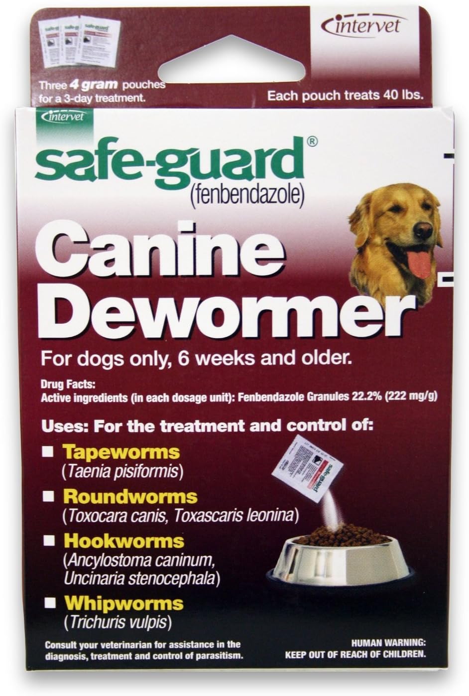 For the treatment and control of Roundworms (Toxocara canis Toxascaris leonina) Hookworms (Ancylostoma caninum Uncinaria stenocephala) Whipworms (Trichuris vulpis) and Tapeworms (Taenia pisiformis). Safe-Guard Canine is safe for use in puppies 6 weeks or older and adult dogs including pregnant bitches. Do not deworm a dog or puppy that is sick. Consult your veterinarian for diagnosis of the illness.Active IngredientFenbendazole Granules 22.2% (222 mg/g)Directions: The daily dose for Safe-Guard Canine is 50 mg/kg (22.7 mg/lb) of body weight. Please refer to the following dosing table for help in finding the right dose for your dog.The daily dose for Safe-GuardCanine is 50 mg/kg (22.7 mg/lb) of body weight. Please refer to the followingdosing table for help in finding the right dose for your dog.Dosing Table10 pounds: 1 gram 20 pounds: 2 gram 30 pounds: 1 gram + 2 gram 40 pounds: 4 gram 50 pounds: 1 gram + 4 gram 60 pounds: 2 gram + 4 gram 80 pounds: 4 gram + 4 gram Over 80 pounds: Use combinations to obtain recommended daily dose. *Packet size is the daily dose. The dog must be treated with this dose for 3 days in a row.You should weigh your dog to make sure you are using the right size and number of packets. If your dogs weight is in-between the suggested dosing sizes it is safe to use the next higher size. For example a 15-pound dog should be treated with the 2-gram packet.Give Safe-Guard Canine to your dog by mixing the daily dose with a small amount of the usual food. Make sure your dog eats all of the medicated food. You may need to moisten dry dog food to aid mixing. Repeat the daily dose for three days in a row.
