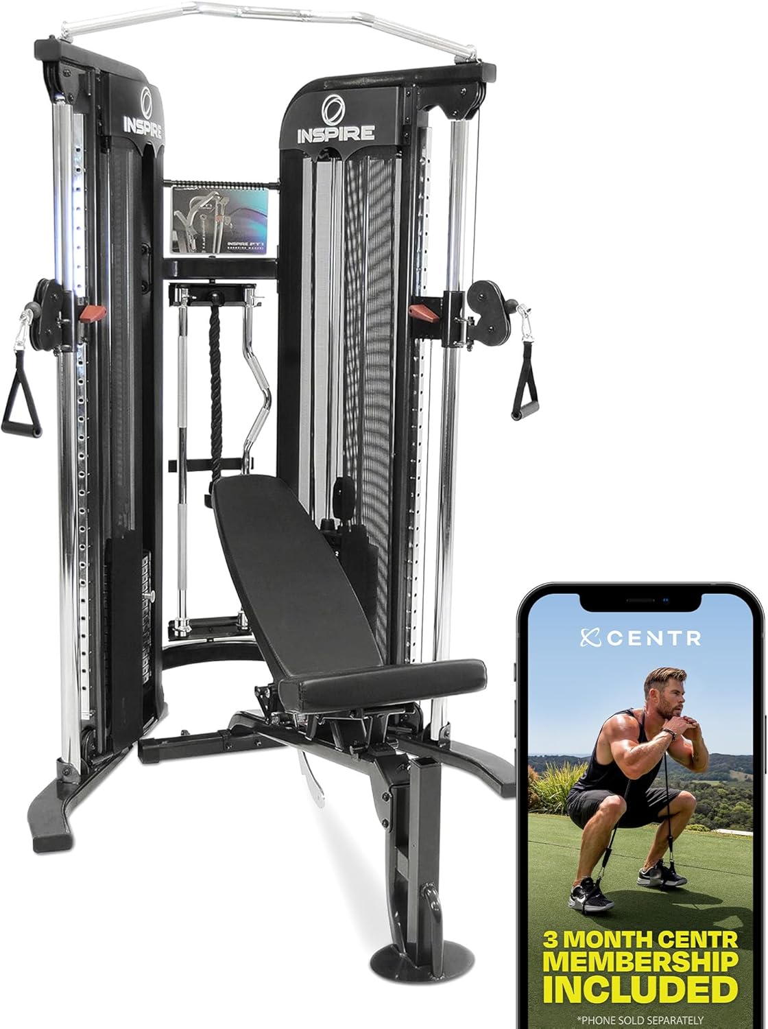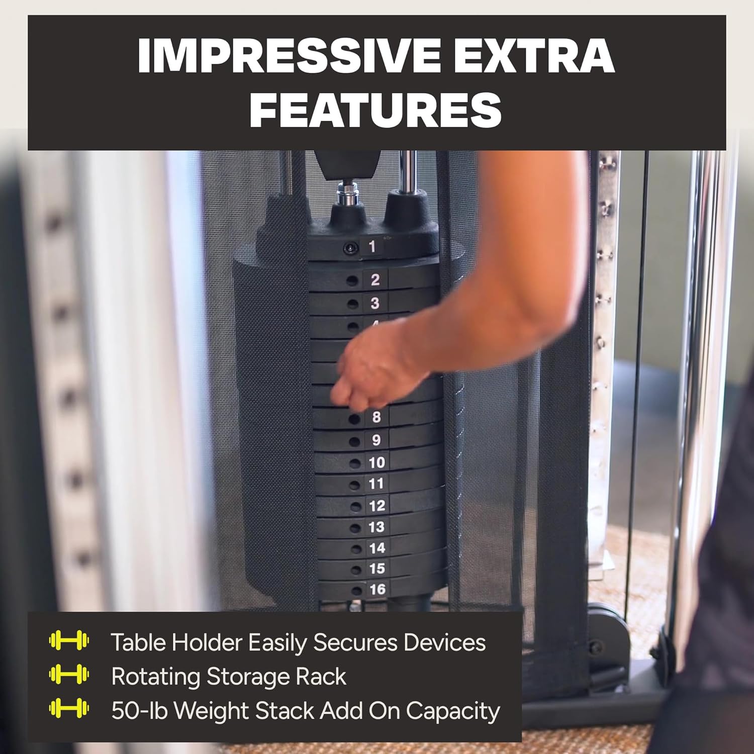 IMPRESSIVE EXTRA FEATURES: Designed to easily secure your phone or tablet during workouts, a built-in, rotating storage rack to keep your accessories organized, and capacity to upgrade to our Inspire Fitness 50 lb Weight Stack Add-On