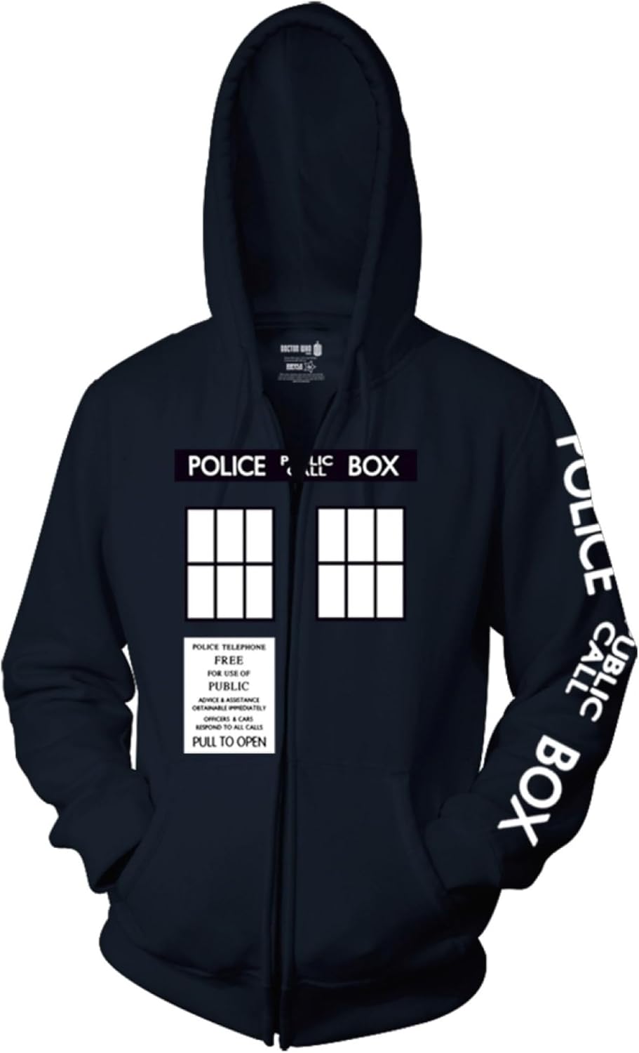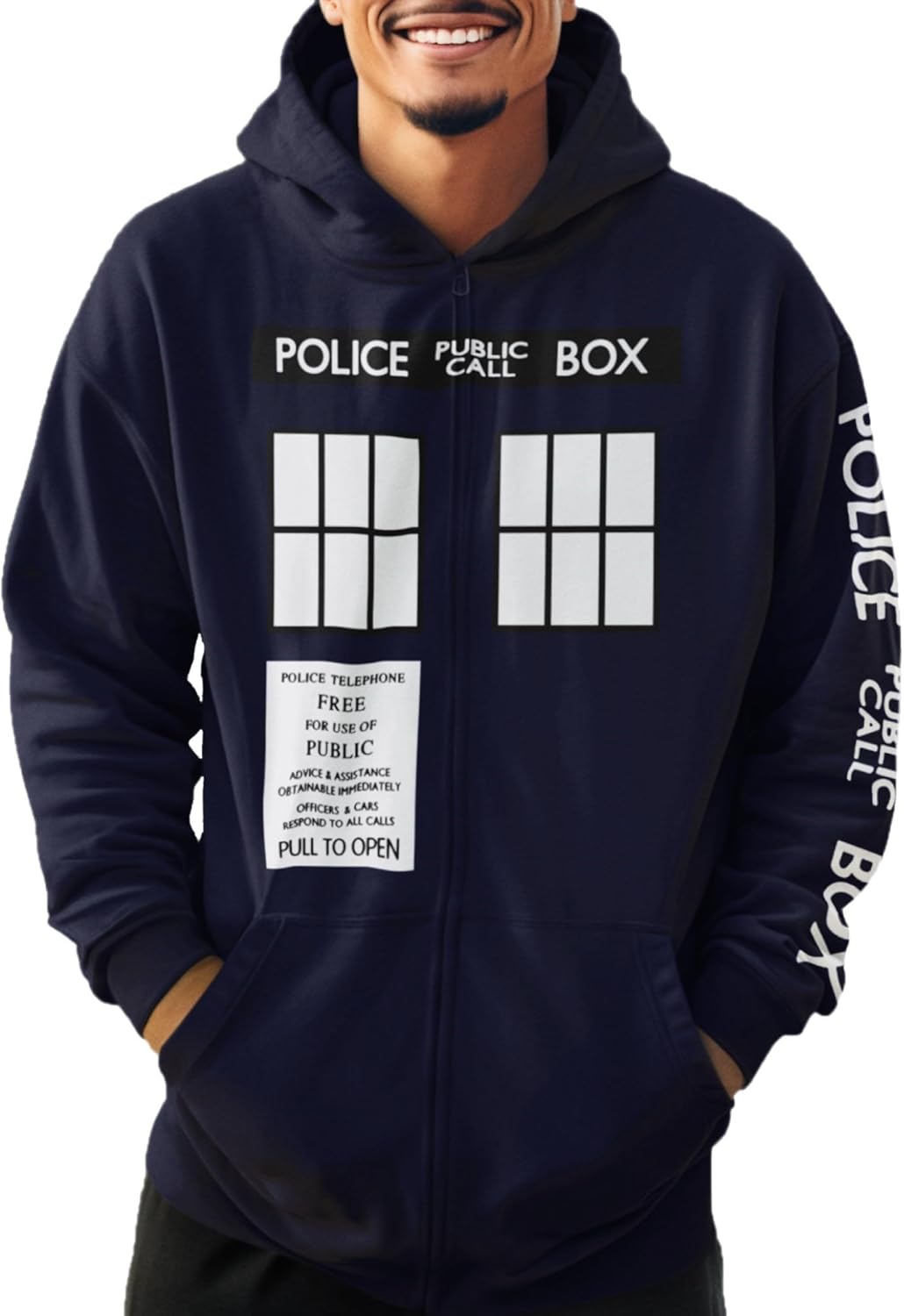 Ripple Junction Doctor Who Men’s Full Zip-Up Hooded Sweatshirt Tardis Police Public Call Box Pull to Open Officially Licensed