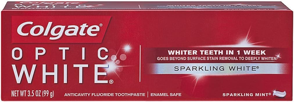 Colgate Optic White Sparkling Mint whitening toothpaste goes beyond surface-stain removal to deeply whiten teeth for a brighter smile. With regular use, this anticavity fluoride toothpaste removes stains beyond the surface to deeply whiten teeth with hydrogen peroxide, unlike ordinary toothpaste and it has a cool fresh mint flavor to help freshen your breath. Colgate Optic White whitening toothpaste, icy mint, is enamel safe and whitens teeth in 1 week.