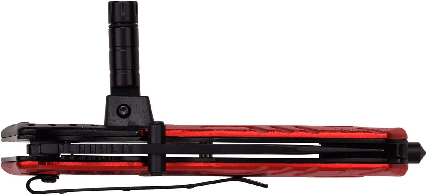 SPECIAL FEATURES: Finger Flipper, Liner Lock, Partially Serrated Black and Satin Finish Stainless Steel Drop Point Blade, Red and Black Aluminum Handle with Fire Fighter Logo, Includes Rope Cutter, Glass Punch, LED Flashlight and Pocket Clip.