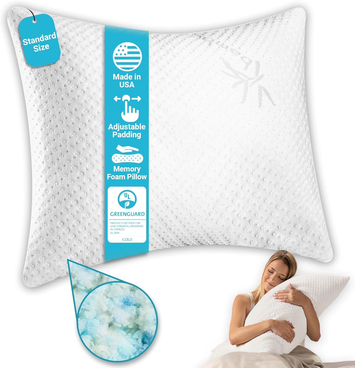Xtreme Comforts Pillows for Sleeping - GreenGuard Gold Certified Adjustable Standard Memory Foam Pillow for Side, Back & Stomach Sleepers w/Removable Cooling Zipper Cover - Made in The USA