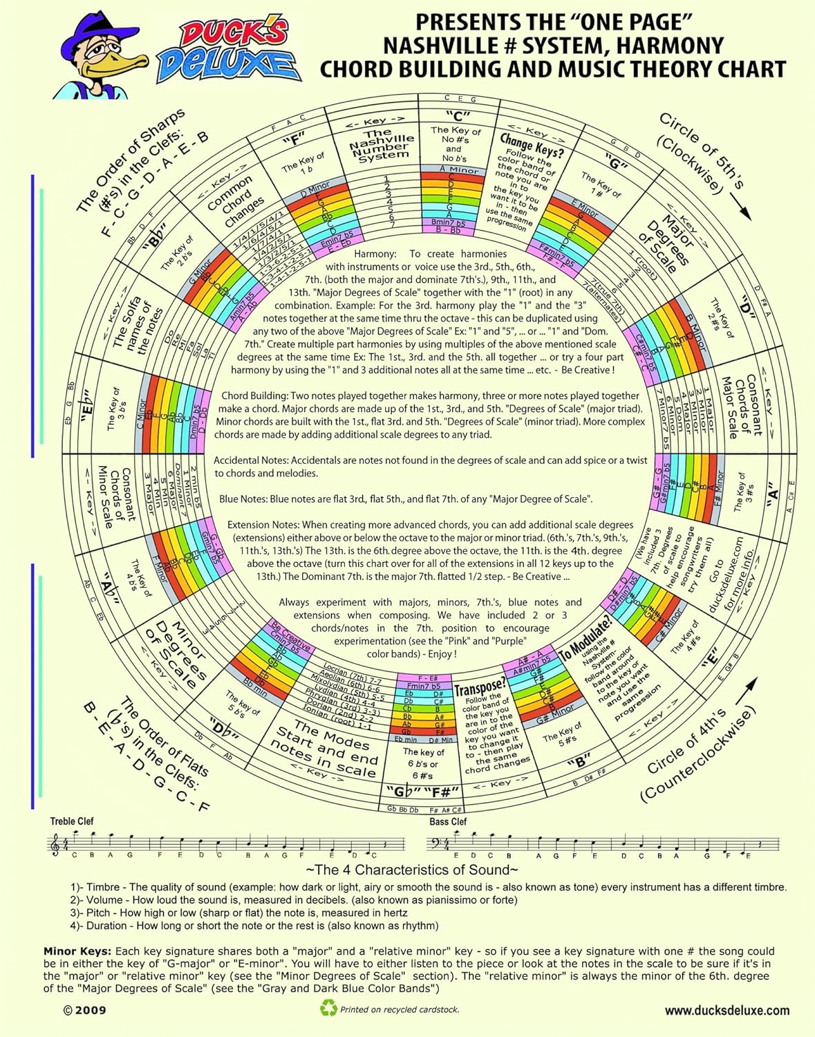 3)- The CHART OF HARMONY and MUSIC THEORY EQUATIONS = Change Keys in a hurry in all 12 Keys, includes every note in Western Music, starts with the Circle of 4th.’s and 5th.'s and includes The Modes, The Nashville # System, The Do-Re-Mi's, The Diatonic Scale Degrees, The Major and Minor Degrees of Scale + more in all 12 keys. No pages to turn - No Music Reading is Necessary - this Chart has been described as equal to the 1st. five chapters of a university music theory textbook, the ultimate resource to learn or review all aspects of Creating Harmony.