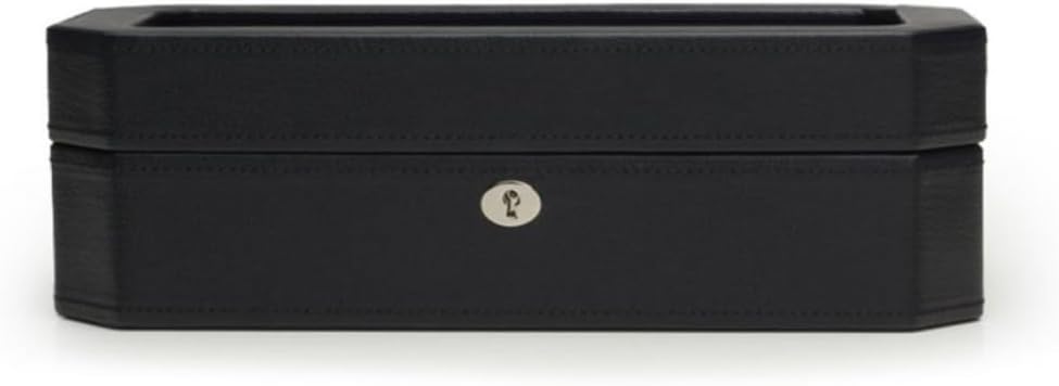Caja para relojes Windsor de 5 piezas de Wolf. El Windsor, una caja de reloj inspirada en mediados de siglo, combina colores nítidos con bordes suaves. Incluye herrajes con acabado cromado, tapa de vidrio con cierre, piel sintética, forro de seda texturizada y almacenamiento para relojes de 5 piezas. Materiales: cuero. Dimensiones: 5.75 pulgadas de largo x 12.5 pulgadas de ancho x 4 pulgadas de alto. Peso: 4 libras