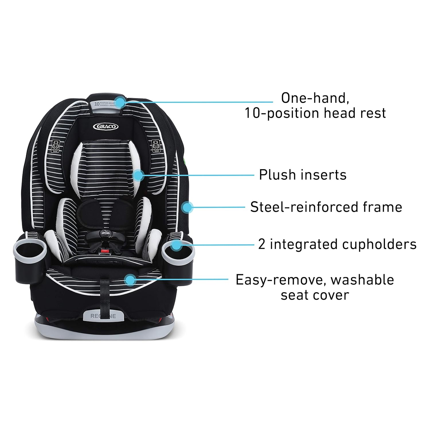 Graco 4Ever 4-in-1 Car Seat gives you 10 years with one car seat. It's comfortable for your child and convenient for you as it transitions from rear-facing infant car seat (4-40 lbs) to forward-facing 5-point harness seat (22–65 lbs) to high-back belt-positioning booster (30–100 lbs) to backless belt-positioning booster (40-120 lbs). For a proper fit, the Simply Safe Adjust Harness System and 10-position headrest lets you adjust the harness and headrest together, with no rethreading. The 6-position recline keeps your child comfortable, while the InRight LATCH system with one-second attachment makes installation easy. It's the only seat that truly goes from baby to booster.