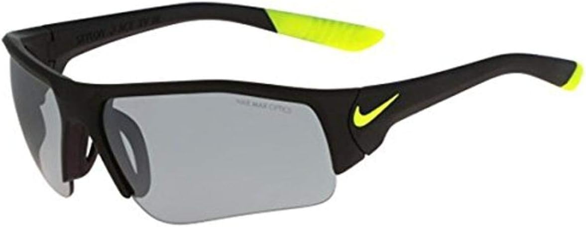 NIKE EV0900-007 skylon ace XV Jr sunglasses matte black/volt, grey w/Silver Flash lens features NIKE max optics for precise visual information at all angles of view. These skylon ace XV Jr sunglasses have a lightweight nylon frame for comfort and durability with cam-action hinges that snap firmly into place. There is a ventilated nose bridge that improves comfort and reduces fogging. The secure-wrap temples with rubber tips have been added for stability, comfort and grip. These lenses are deep cut for maximum coverage. There is an 8 base sport frame design to maximize coverage, minimizes interference. 100 percent UVA/UVB protection. Carl Zeiss lenses for kids that are formulated for developing eyes. A pouch is included.