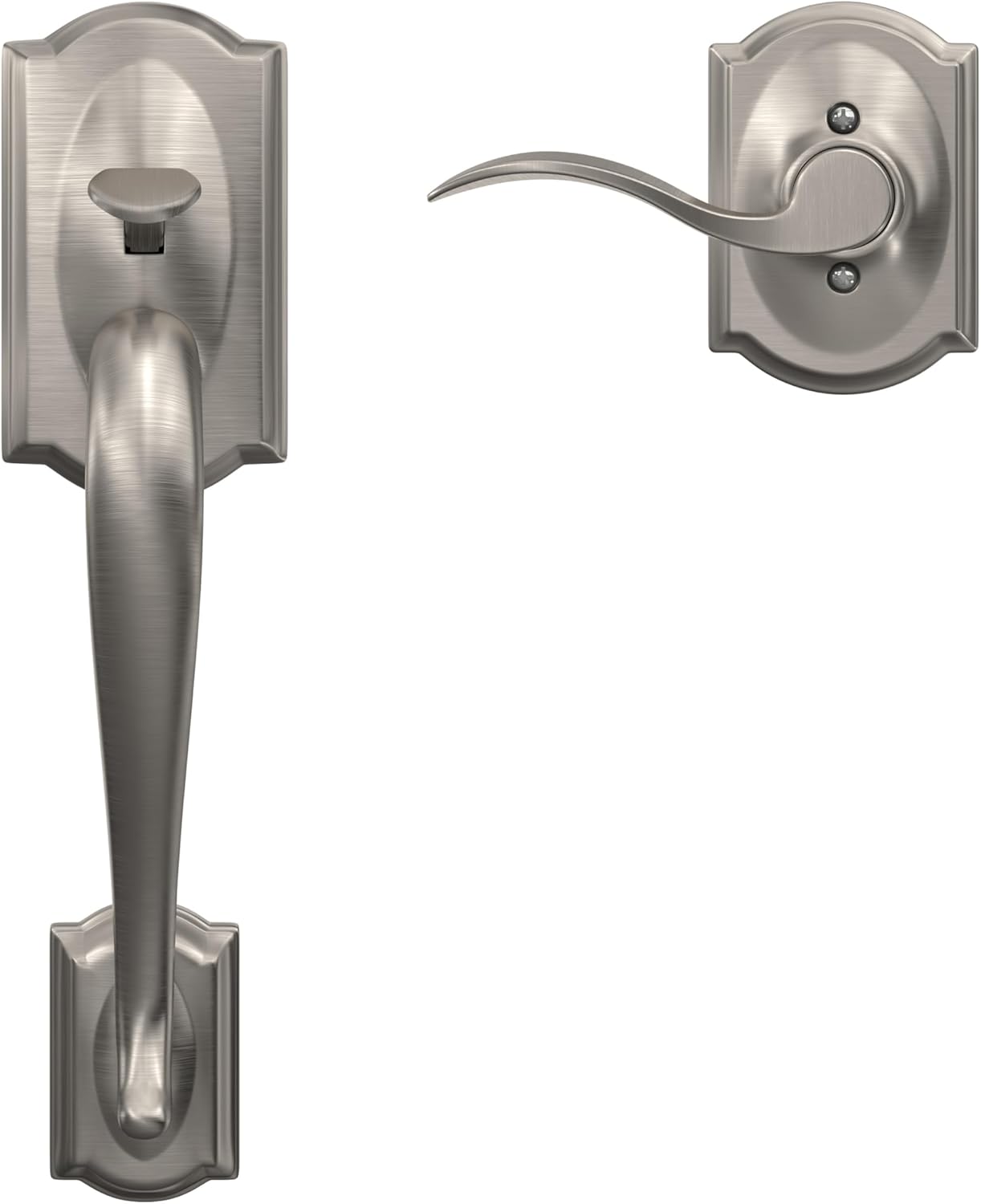 The SCHLAGE Camelot Lower Half Handle set and Accent Lever with Camelot Trim in Satin Nickel is perfect for use with an electronic deadbolt for a complete front entry set. The Accent lever is widely popular for its elegant wave-like design that effortlessly matches a room's style without overshadowing it, while the Camelot trim's scalloped architectural details make any room charming and approachable. The smooth, clean look stands out – especially when wrapped in our versatile Satin Nickel finish. Plus, it's been designed and tested with strength and durability in mind.