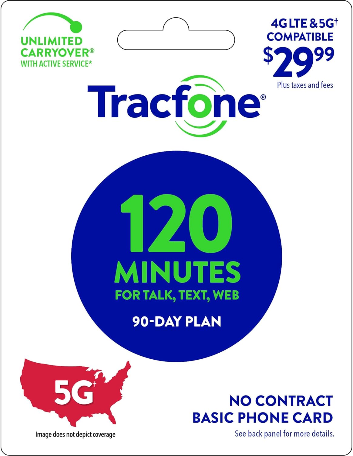 Plan de teléfono básico de TracFone de 29,99 dólares, 120 minutos, 90 días [entrega física]