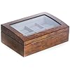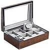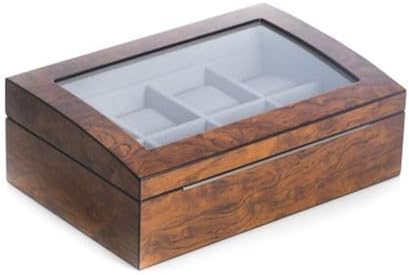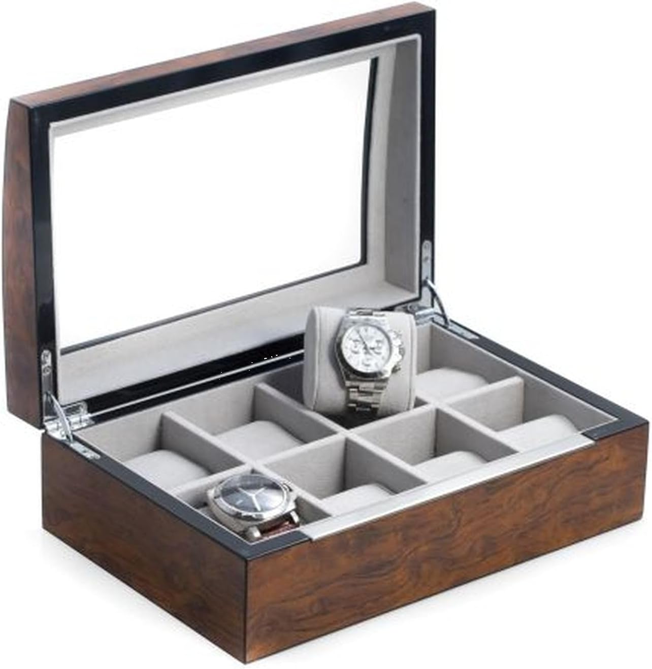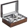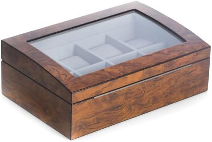 Bey-Berk BB680BRL Lacquered Brown Burl Wood 8 Watch Case with Glass Top and Stainless Accents. Soft Velour Lined with Hideaway Hinges