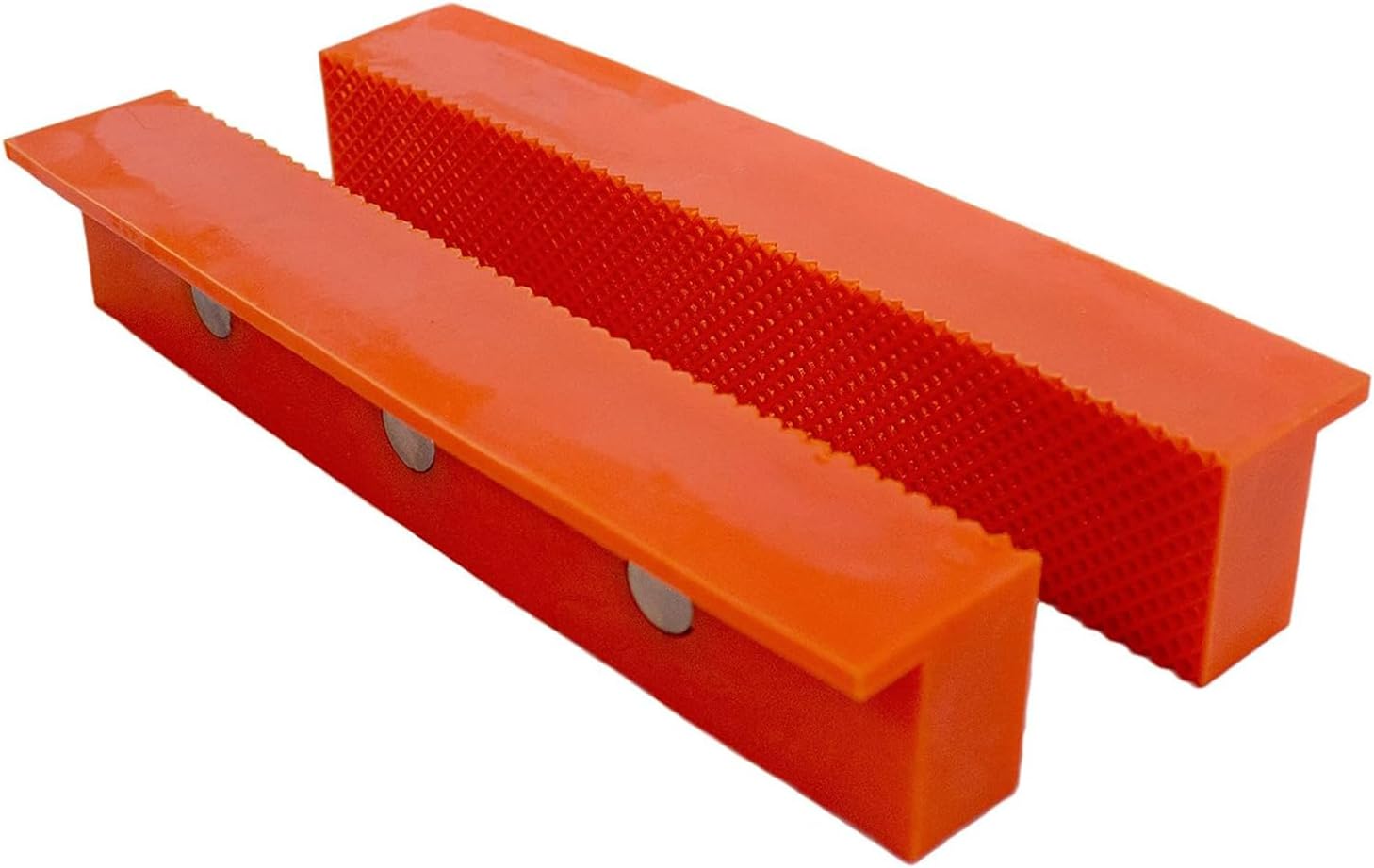 TECHNICAL SPECS: 6” (15.2mm) vise jaw covers feature Special designed diamond pattern surface holds and protects parts while clamping. Designed to fit any 4-6 in. (76-152mm) vise jaw; (3) Three strong embedded magnets keep jaw covers in place securely versus (2) magnets.