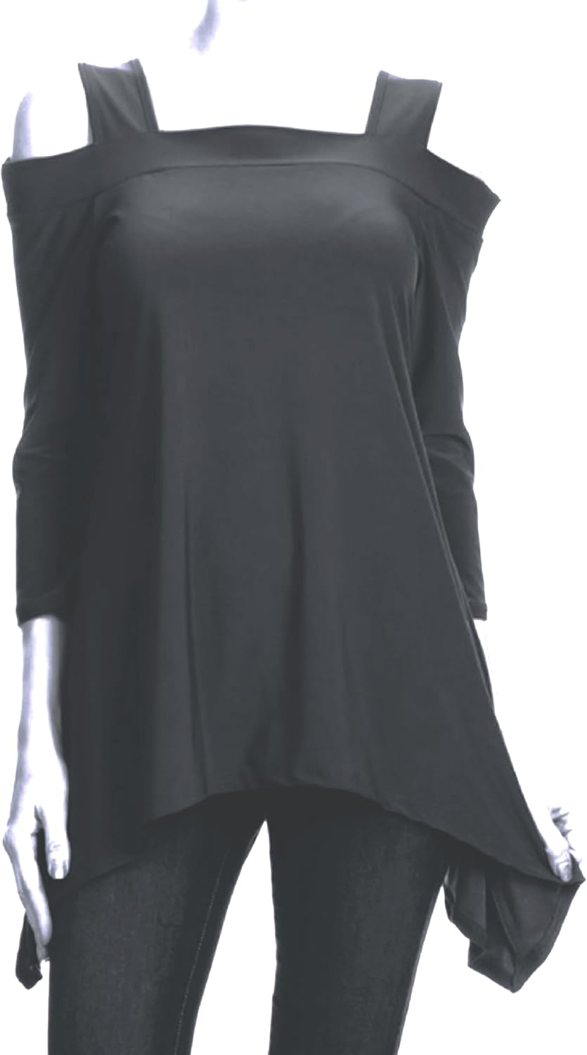 Love My Seamless Womens Asymmetrical 3/4 Sleeve Tunic with Cold Shoulder Cut Outs (XL, Black)