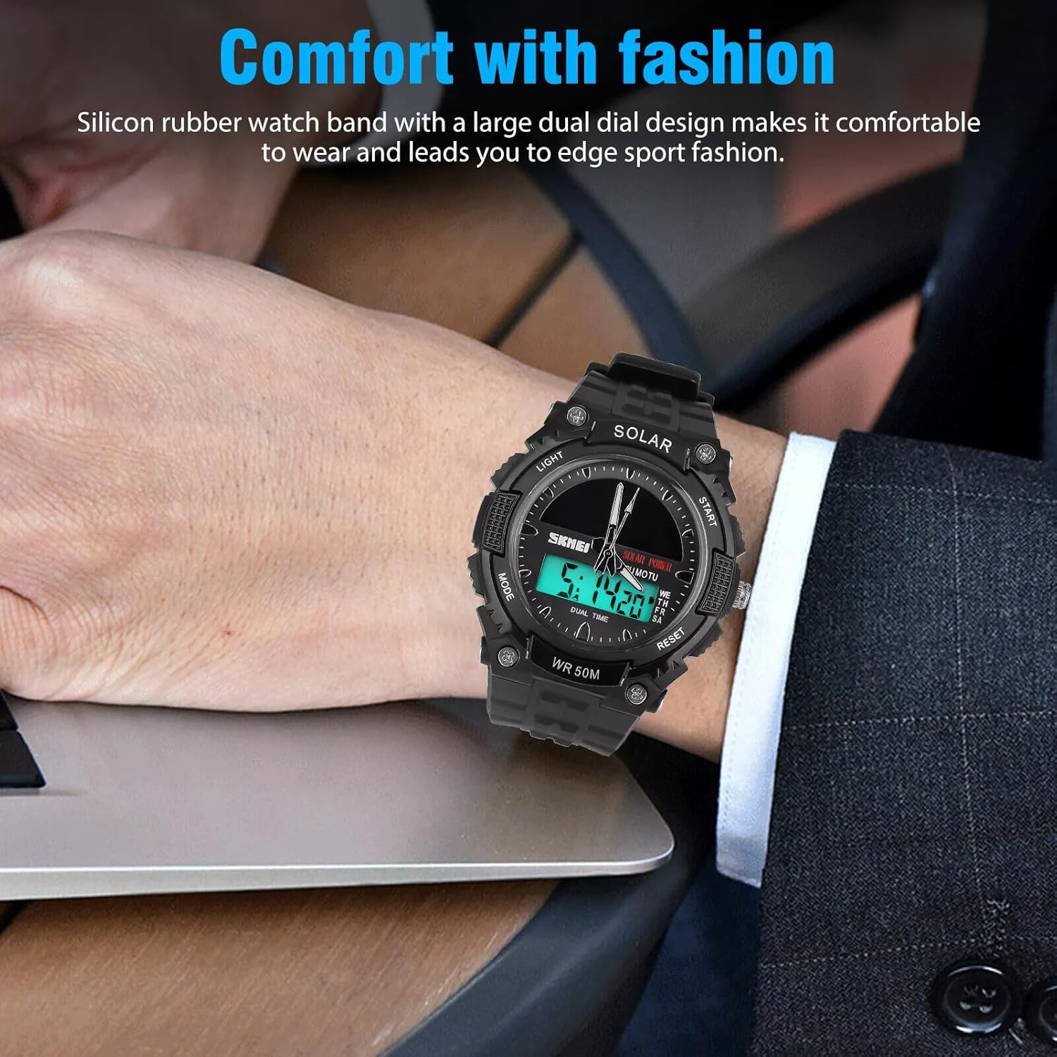 Solar Powered Energy Watch for Men Military Digital Multifunctional Led Luminous Indication 2 Time Zone 50m Waterproof Watch Reloj Solar para Hombre