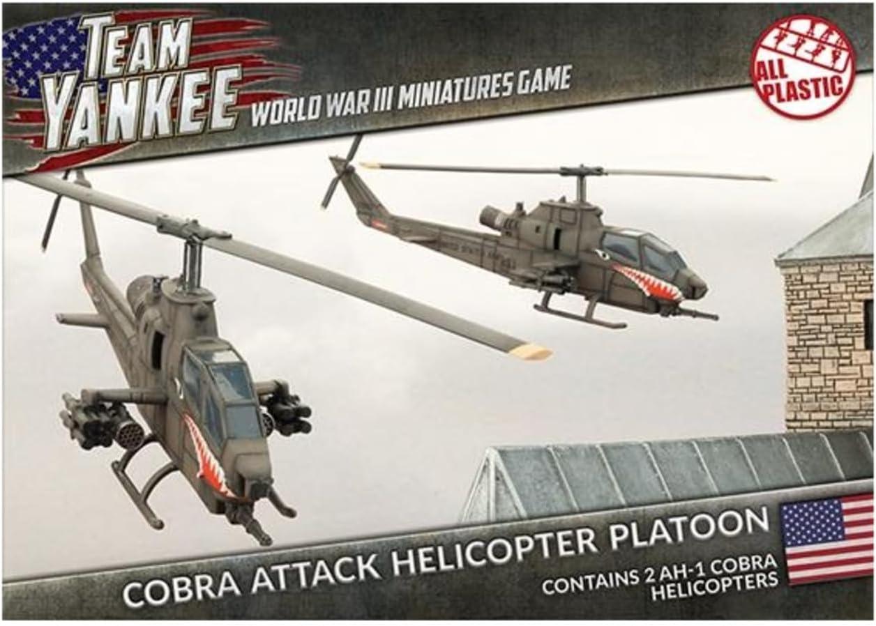 World War III Team Yankee: Escuadrilla de Helicópteros de Ataque Cobra Americano El AH-1S Cobra es la última versión del Hueycobra de la era de Vietnam y se distingue fácilmente por su tejado más plano y no reflectante y los cuatro tubos de misiles Improved TOW montados a cada lado. Este Cobra es un cazador de tanques, que se basa en su perfil frontal estrecho, el largo alcance del misil Improved TOW y la hábil pilotaje para permanecer sin ser detectado mientras caza a su presa. La ametralladora Gatling M197 de 20 mm montada en la barbilla del Cobra hace corto trabajo de la infantería, vehículos ligeramente blindados y cualquier helicóptero enemigo que pueda encontrarse. Contenido del paquete: - 2 x helicópteros AH-1 Cobra de plástico - 2 x soportes de vuelo de plástico - 8 x imanes de tierras raras Información del paquete: - El producto es para uso en el juego de mesa de miniaturas Team Yankee / Flames of War: WWIII. - Los modelos pueden requerir ensamblaje. - Cualquier escenario, pintura o pegamento mostrado se vende por separado. País/Facción: Estados Unidos/América, Israel Número de pieza del producto: TUBX05