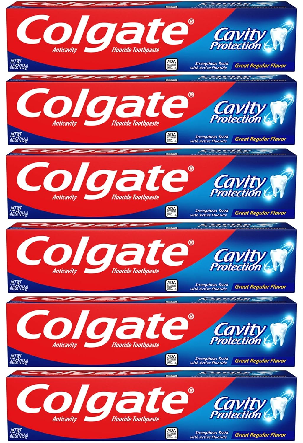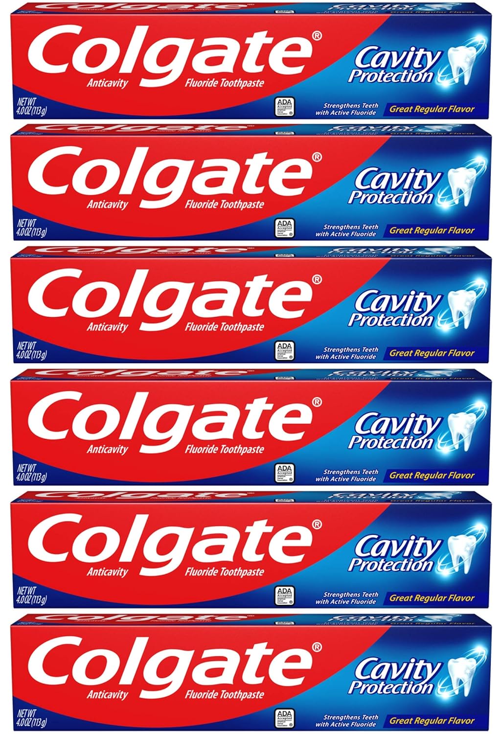 Colgate Cavity Protection provides trusted cavity protection for the entire family. Formulated with active fluoride, it is clinically proven to help strengthen teeth and leave your mouth feeling fresh and clean. This Colgate toothpaste is ADA (American Dental Association) accepted. It has been trusted by dentists and parents globally for over 45 years.