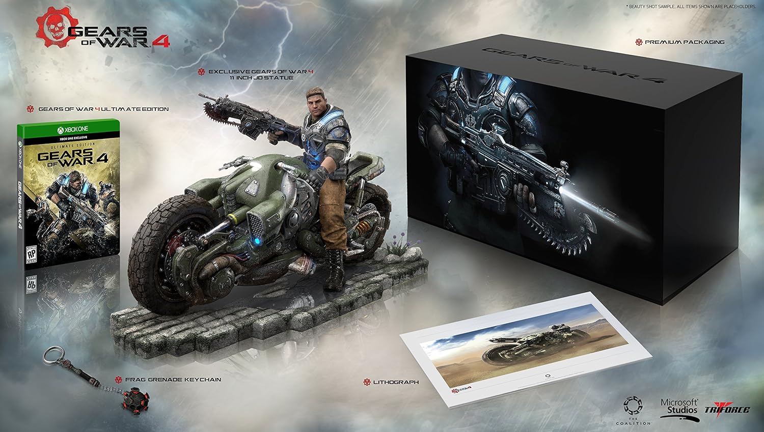 Brought to you by TriForce - The Gears of War 4: Collector's Edition includes: Gears of War 4 Ultimate Edition Steelbook + Season Pass, JD Fenix on COG Bike Premium Statue (19 inches in length), Excluisve Lithograph, Frag Grenade Keychain (6 inches in length), In Game Bonus Content Including 3 Gears Crates, and a Premium Packaging Box. Gears of War 4 Ultimate Edition is your gateway to Early Access for Gears of War 4, allowing you play on Friday, October 7 - four days before the game's standard release date. Season Pass includes the exclusive Vintage VIP Pack, one year of unlimited map access, early access to an exclusive VIP playlist and six Gear Packs.