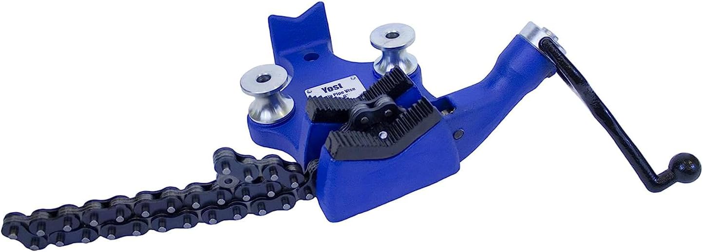 CHAIN VISE: The Yost Vises BC-6 Bench 6 Inch Chain Vise is made with a heavy-duty cast-iron body and a rugged cast-iron base that has handy pipe rest and bender. Also has a replaceable jaw and removable bending dies.