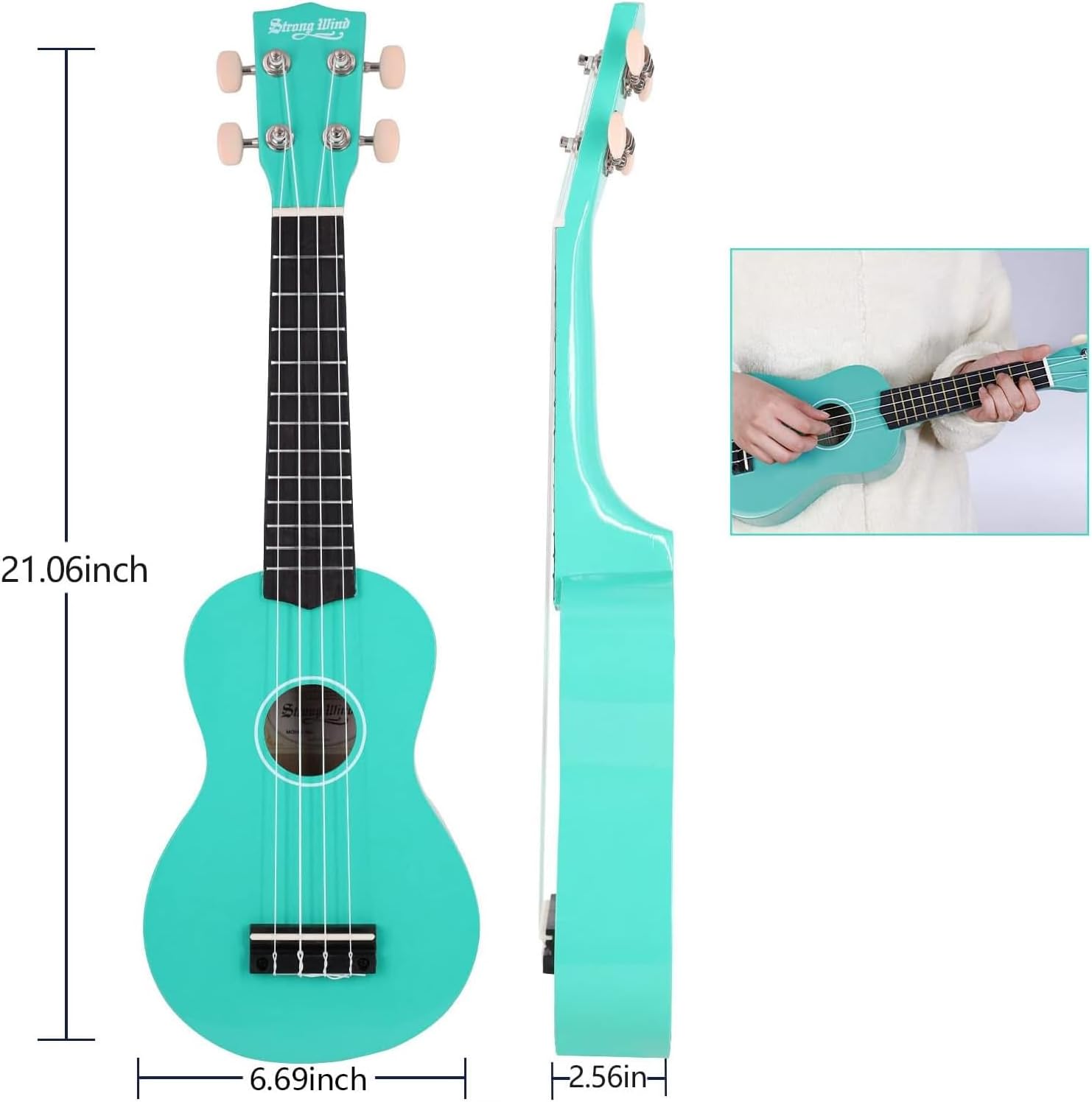 Remium Basswood Body: Real basswood body with a high gloss finish creates clear, crisp and melodious sound. The fretboard are smooth and do no harm to your fingers. This mini cute ukulele has 12 frets on the fingerboard, producing different tones for a song. Strong Wind 21 inch soprano ukulele starter set is the best musical instrument present for friends who want to play music.