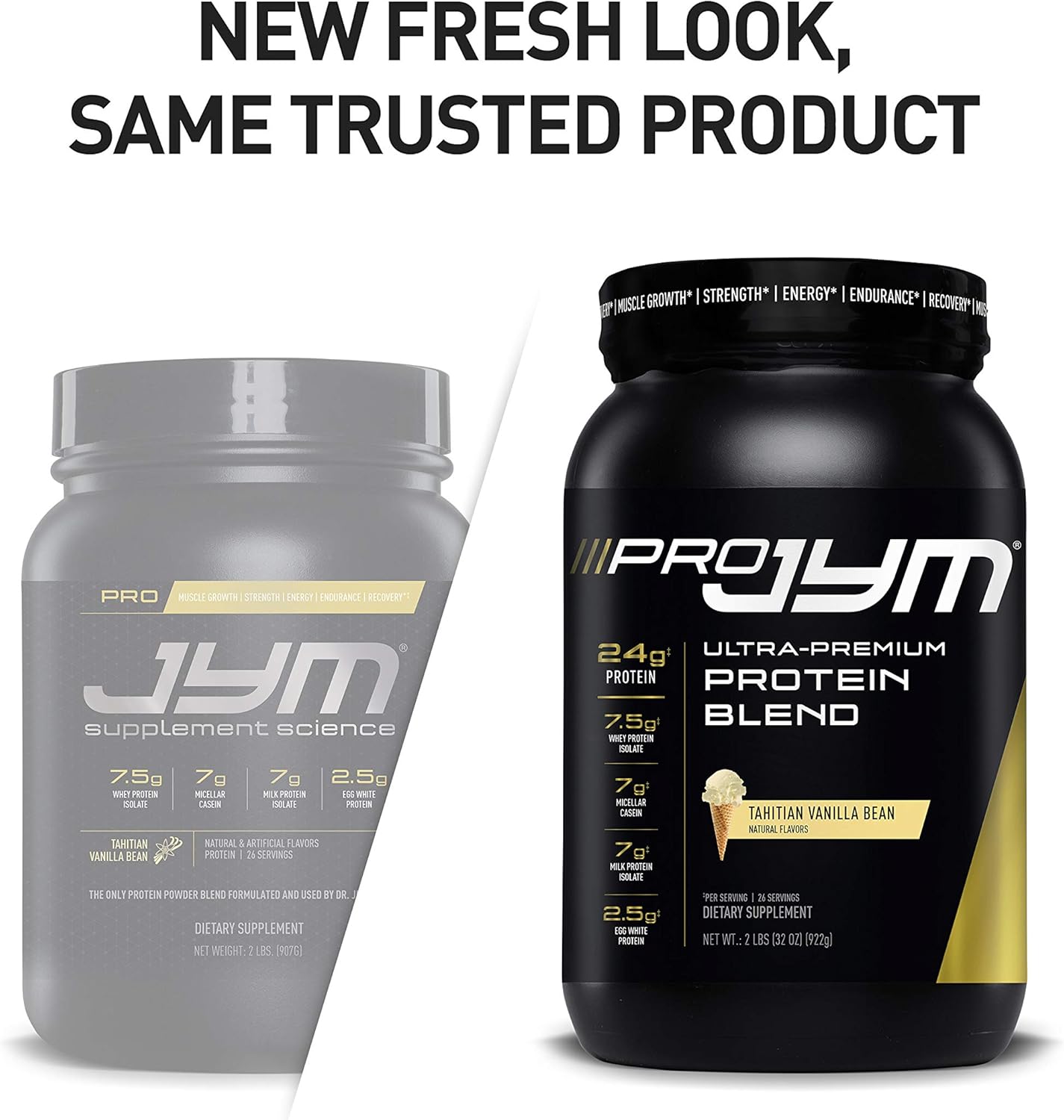 About the Pro JYM Protein Powder: Supported Goals: Muscle - Growth - Strength. What It Is: The perfect blend of three of the most effective types of proteins for building muscle: whey, micellar casein, and egg protein. The three types of protein are absorbed in the body at varying rates of speed – whey extremely fast, casein very slowly, and egg at a “medium” pace. This is exactly how you want your protein to act both before and after workouts to ensure that the muscles get an immediate supply of amino acids (the building blocks of protein) as well as a steady trickle of them in the hours following. Research now suggests that when you add medium-digesting and slow-digesting proteins to fast-digesting whey, muscle protein synthesis remains elevated for longer than when using whey alone. And muscle protein retention is higher, as well. That means that more protein is being built in the muscle. That is what may help lead to long-term gains in muscle growth and strength. What Sets It Apart: Aside from being a protein blend in a crowded market of sometimes underperforming 100% whey protein powders, Pro JYM is also a non-proprietary blend. A proprietary blend is any supplement that doesn't list the precise amount of every single active ingredient it contains. This isn’t just prevalent with pre-workouts and fat-burners – a lot of protein powders on the market are proprietary blends because they don’t tell you the exact amounts of the proteins in the formula. Pro JYM, on the other hand, lists the exact amounts on the front of the container of all three types of proteins in their four distinct forms: whey protein isolate (7.5 grams), micellar casein (7 grams), egg albumen (2.5 grams) and milk protein isolate (7 grams – 5.5 grams casein, 1.5 grams whey). Nitrogen spiking (aka “amino spiking” or “protein spiking”) is an unscrupulous technique where some supplement companies put in less protein than what’s listed on the label as a means of slashing costs and increasing their protein margins – at the user’s expense. Getting a “spiked” protein means paying for, say, 24 grams of protein but getting only 18 grams of actual whole proteins. With Pro JYM, you get all 24 grams, guaranteed. Pro JYM is not and never will be spiked with cheap fillers.