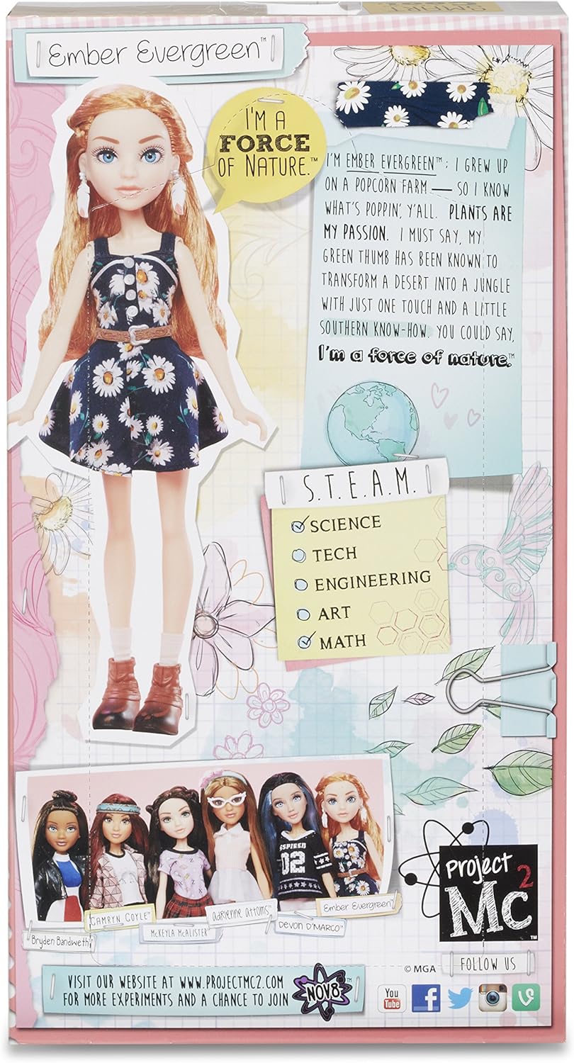Project Mc2 is a team of four super-smart and seriously cool girls who use their love of science and their spy skills as they go on missions for secret organization, NOV8 (that's "innovate"!). And now there are two new recruits! They're real girls with real skills ready to take on anything. Watch new episodes of the Project Mc2 original series, only on Netflix! Meet Ember Evergreen, earthy scientist and newest member of Project Mc2! Plants are her passion. Her green thumb can transform a desert into a jungle with just one touch and a little Southern know-how. She's a force of nature! Doll Features: - Articulated Ember doll is dressed in a totally cool outfit that reflects her personality and individual style - She's a Southern belle with sweet, country girl flair! - Also includes a beaker-shaped comb - Doll is 11.75 inches tall - Ages: 6+ years.