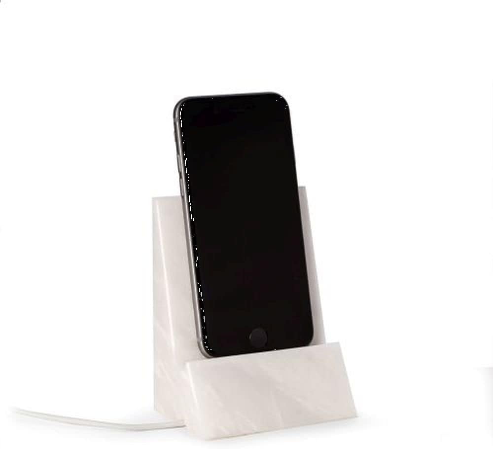 White Marble Desktop Phone / Tablet Cradle with a Pass-thru Hole for Charging Cable.