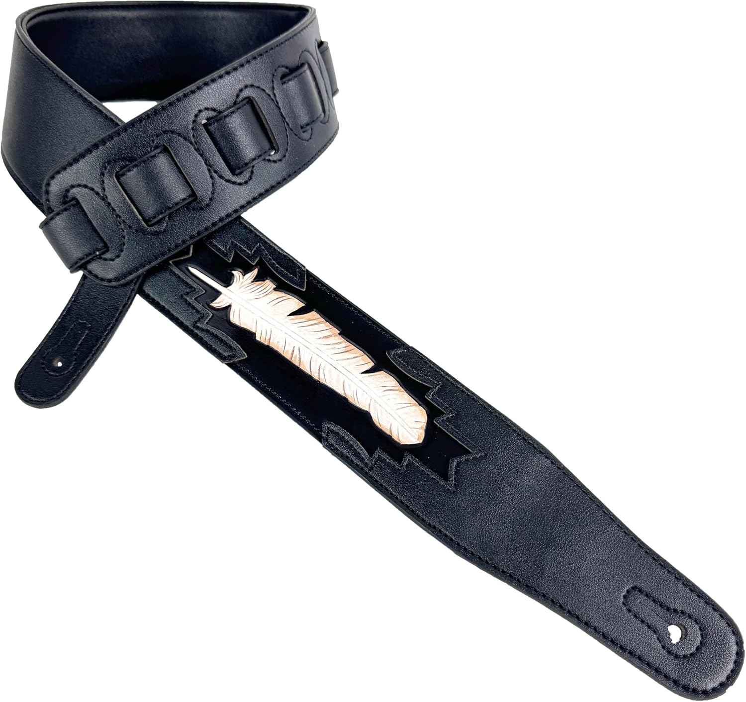 Walker & Williams CVG-115 Black Leather Padded Guitar Strap Hand Tooled Feather For Acoustic, Electric, And Bass Guitars