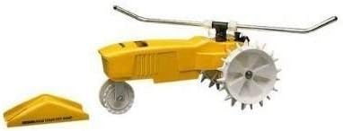 Rain TrainTraveling Sprinkler With a rustproof cast iron construction, the sprinkler waters up to 13,500 square feet, though covering a lesser area of 11,900 square feet ensures more effective performance. The sprinkler arms adjust for varied spray patterns and arcs, throwing water from 15 to 56 feet. The sprinkler waters as it travels along a hose on a preset route, much like an electric model train, except with a hose as the rails. To water, the homeowner lays out the hose as desired, taking care to avoid dramatic corners or turnabouts that may result in hose kinks or a derailed sprinkler. A front wheel runs on the hose with the two traction-ready rear wheels bestride. The hose connects to the posterior of the sprinkler. For the best results, LR Nelson recommends a 5/8-inch hose, though a 1/2-inch hose may suffice, up to 200 feet in length. For sprinkling termination, the user places a shut-off ramp on the hose to lift the sprinkler off its "rails," while simultaneous stopping operation. The shut-off ramp should be installed with at least five feet of hose between it and the spigot. The traveling sprinkler operates at two motor speeds, high and low. On high power, the sprinkler travels approximately 37 feet per hour, with a 1/4-inch water application. On low power, the sprinkler moves at a 21 feet per hour rate with a 1/2-inch water application. The simple installation requires no tools. The sprinkler weighs 18 pounds