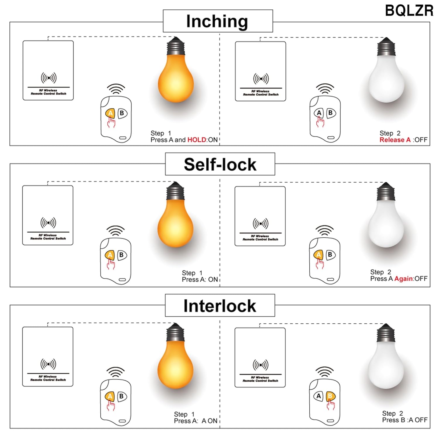 Puede cambiar el modo de trabajo entre incremento (Predeterminado de fábrica), autobloqueo e interbloqueo. Principalmente aplicado para: Control remoto de encendido y apagado de bombas, máquinas-herramientas, luces LED y otros áreas remotas de apoyo civil e industrial