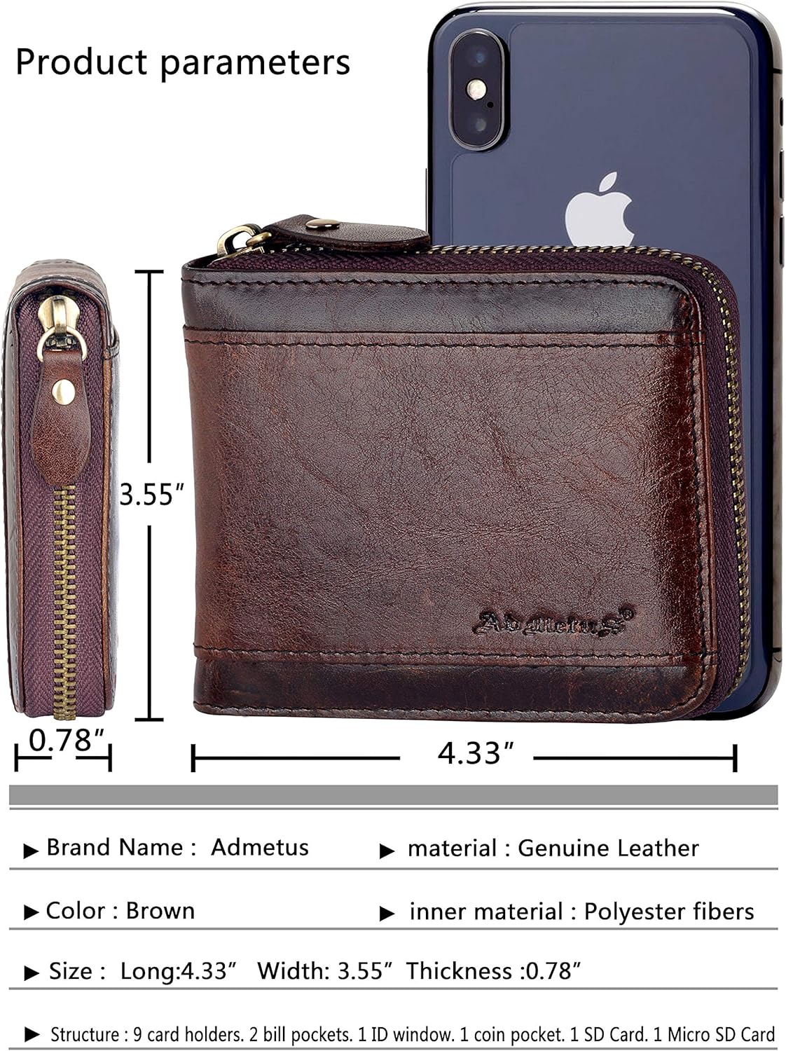 Admetus Mens RFID Blocking Wallets Zipper Leather Wallet for Men Bifold RFID Card Holder