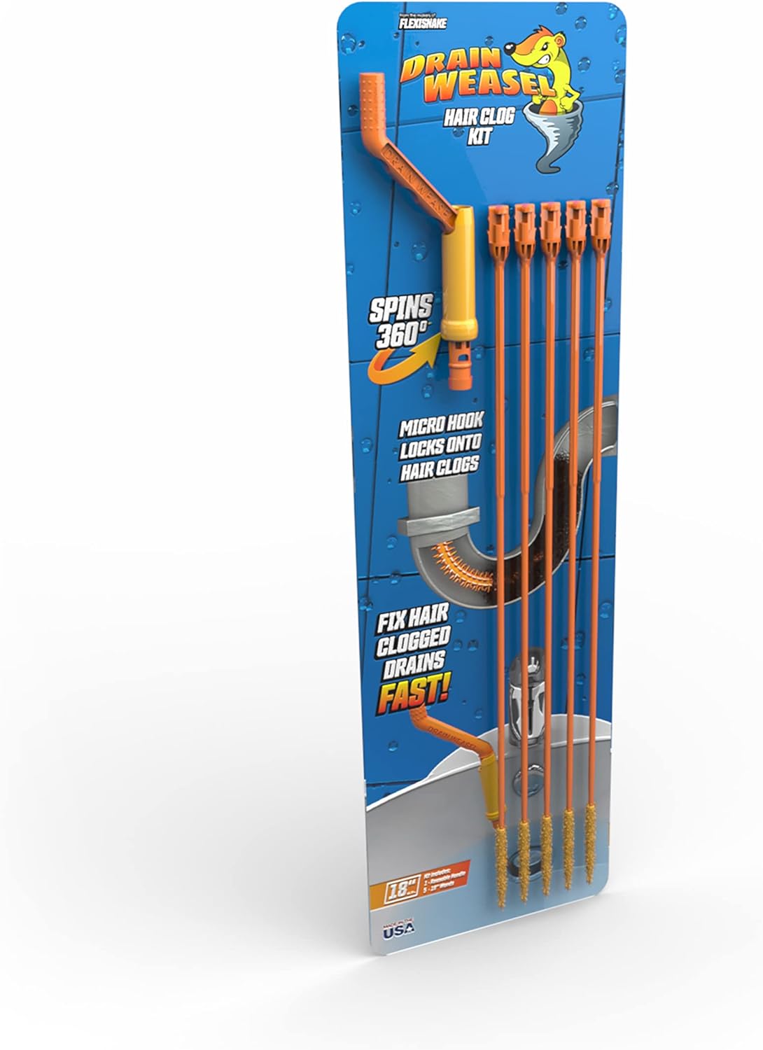 FlexiSnake Drain Weasel Sink Snake Hair Clog Remover Tool, Pipe, Bathroom, Bathtub Cleaner, 18-inch, Made in the USA, 5 Wands and Removable Handle