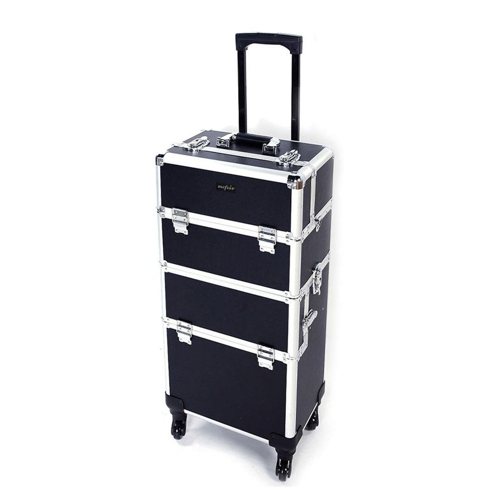 mefeir 2 in 1 Rolling Makeup Train Case, Aluminum Makeup Travel Organizer Cosmetic Case, Cosmetology Display Suitcase on Wheels, Beauty Storage Luggage Lockable w/4 Removable Wheels (Black)