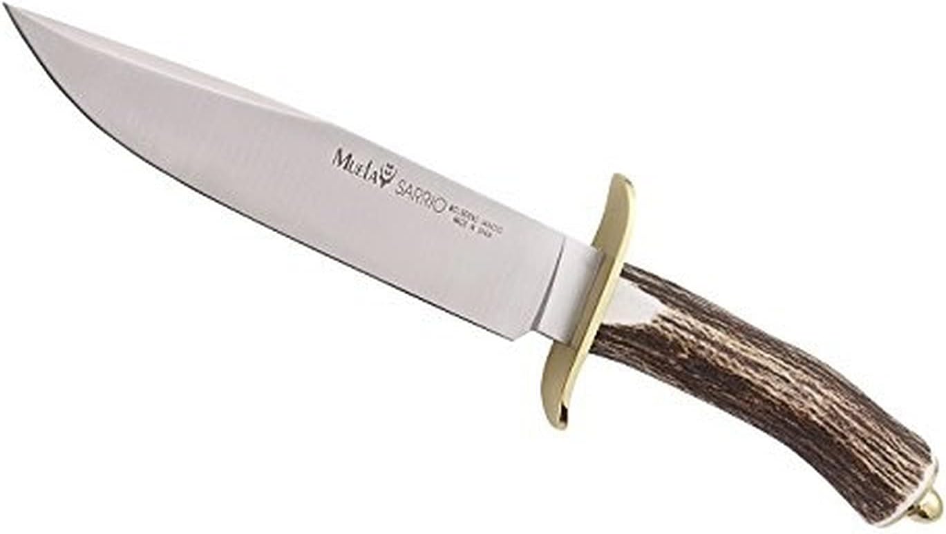 MUELA SARRIO-19A: fixed blade, 7-1/4 inch blade, deer horn handle, brass guard and cap, Plain edge, drop point blade.