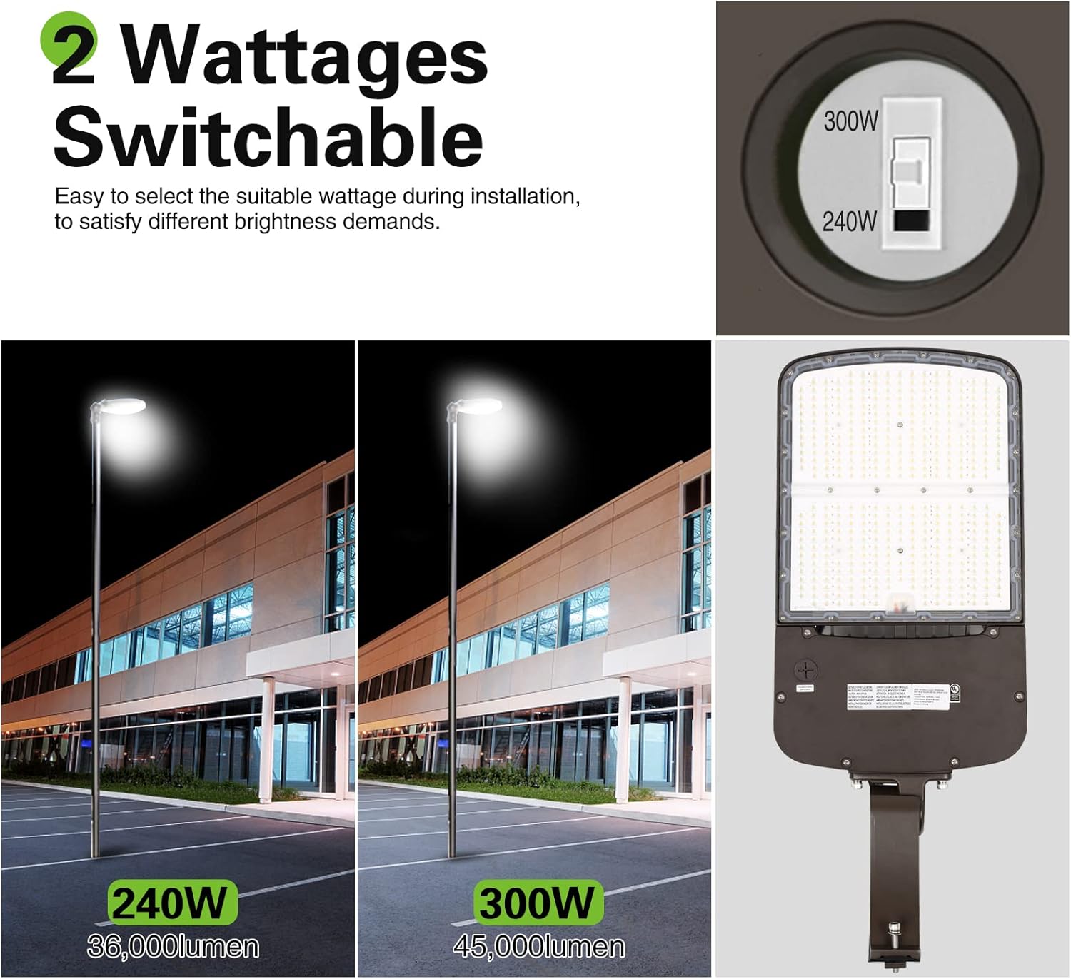 ✔ Energy Saving - This 240W/300W switchable led parking lot light with photocell provides 36000-45000 Lumens at 5000K daylight white. Use brand LEDs with Light efficiency 150lm/w, Ideal to replace traditional 1000w metal halide, energy Savings of up to 70% over our product's lifespan.
