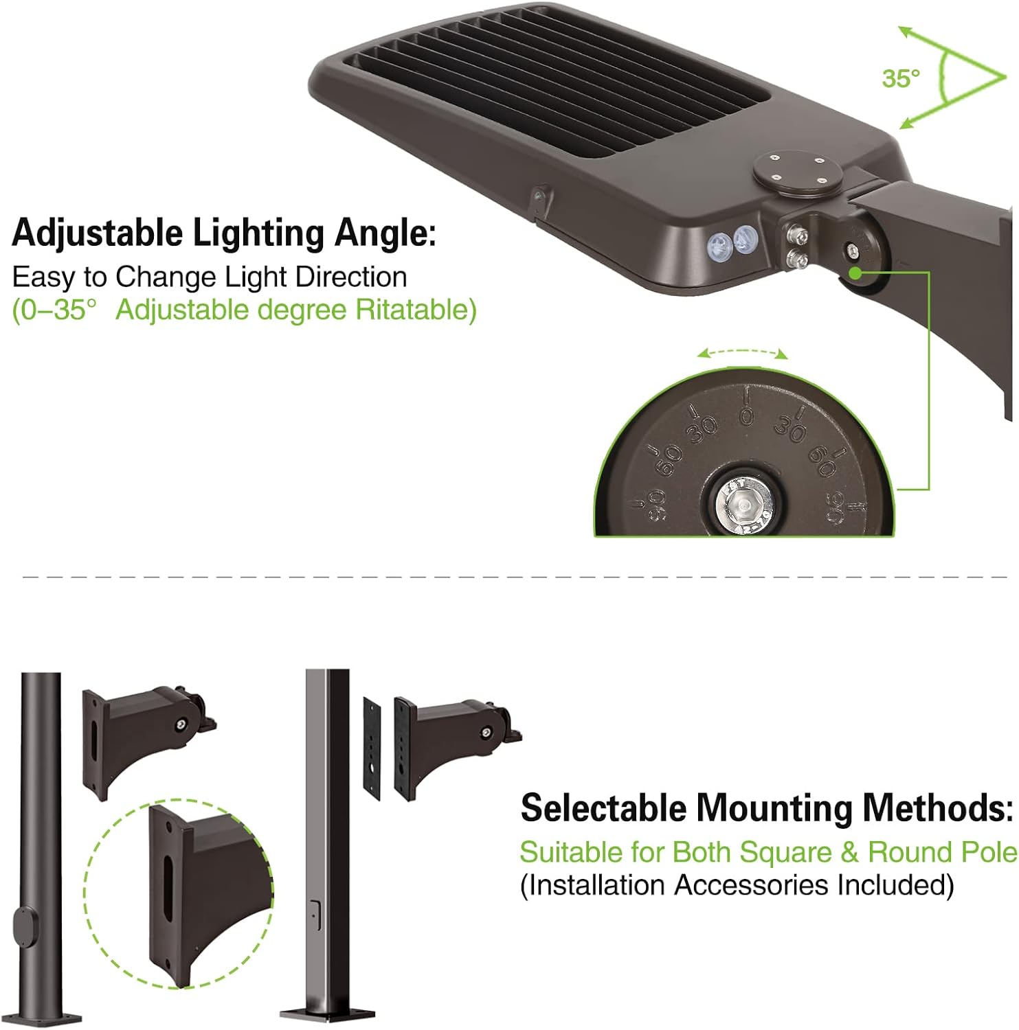 ✔ Easy&Flexible Installation - With an adjustable Arm mount, the pole mounted led shoebox light fixture can be angled up or down from –30~+30 degree. Ideal for basketball court, tennis court, stadium, parking lot, roadways and general illumination of large areas.